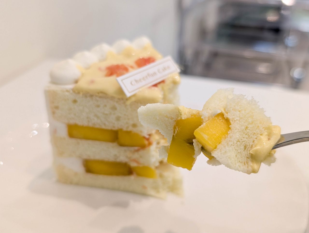 芒果奶醬滋潤著綿密的戚風蛋糕體,