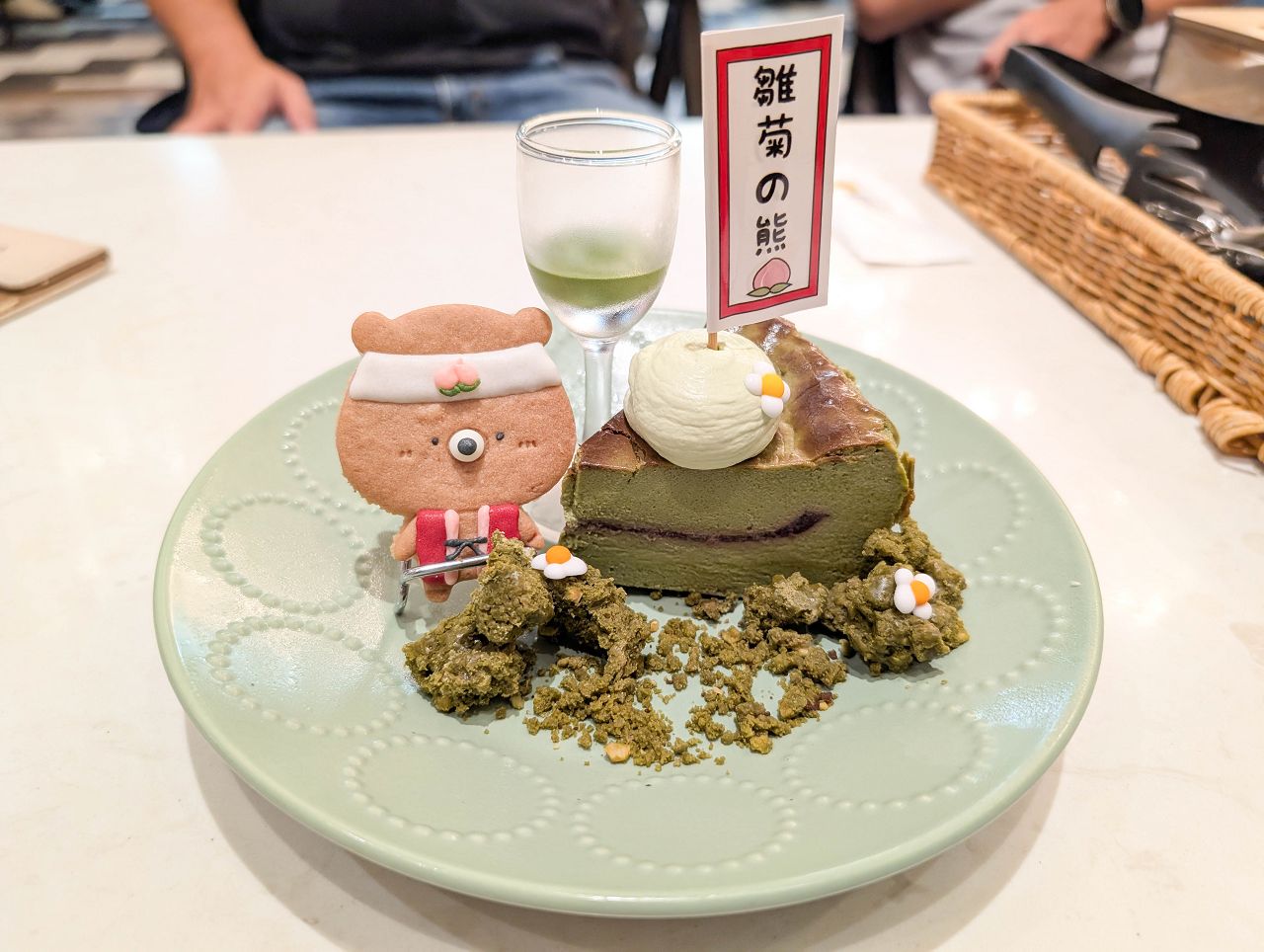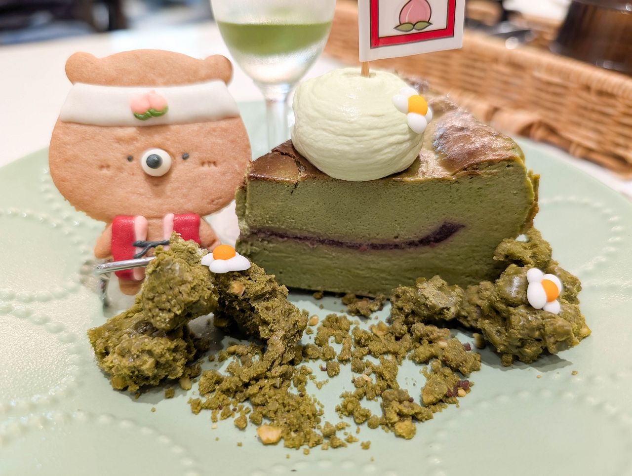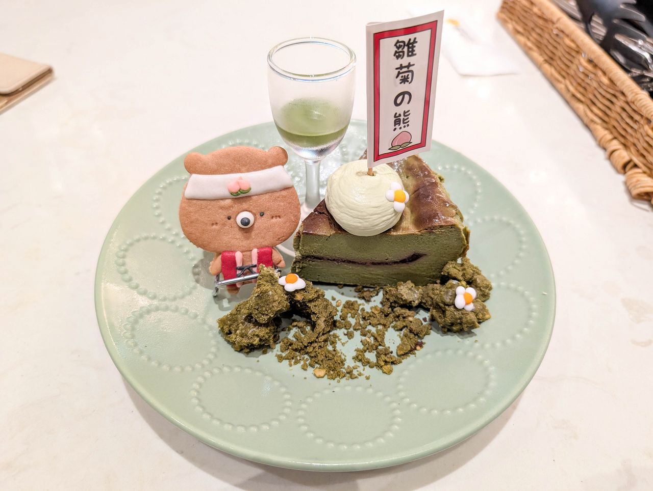 上方擺上手作小熊造型餅乾、抹茶卡士達醬和一串糯米糰子。
