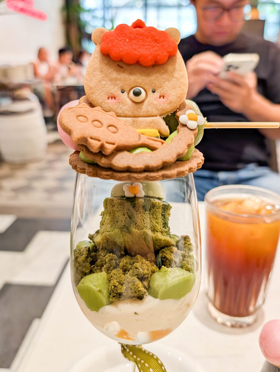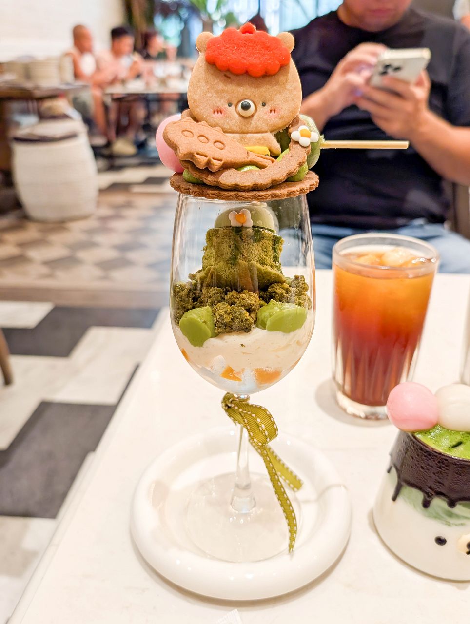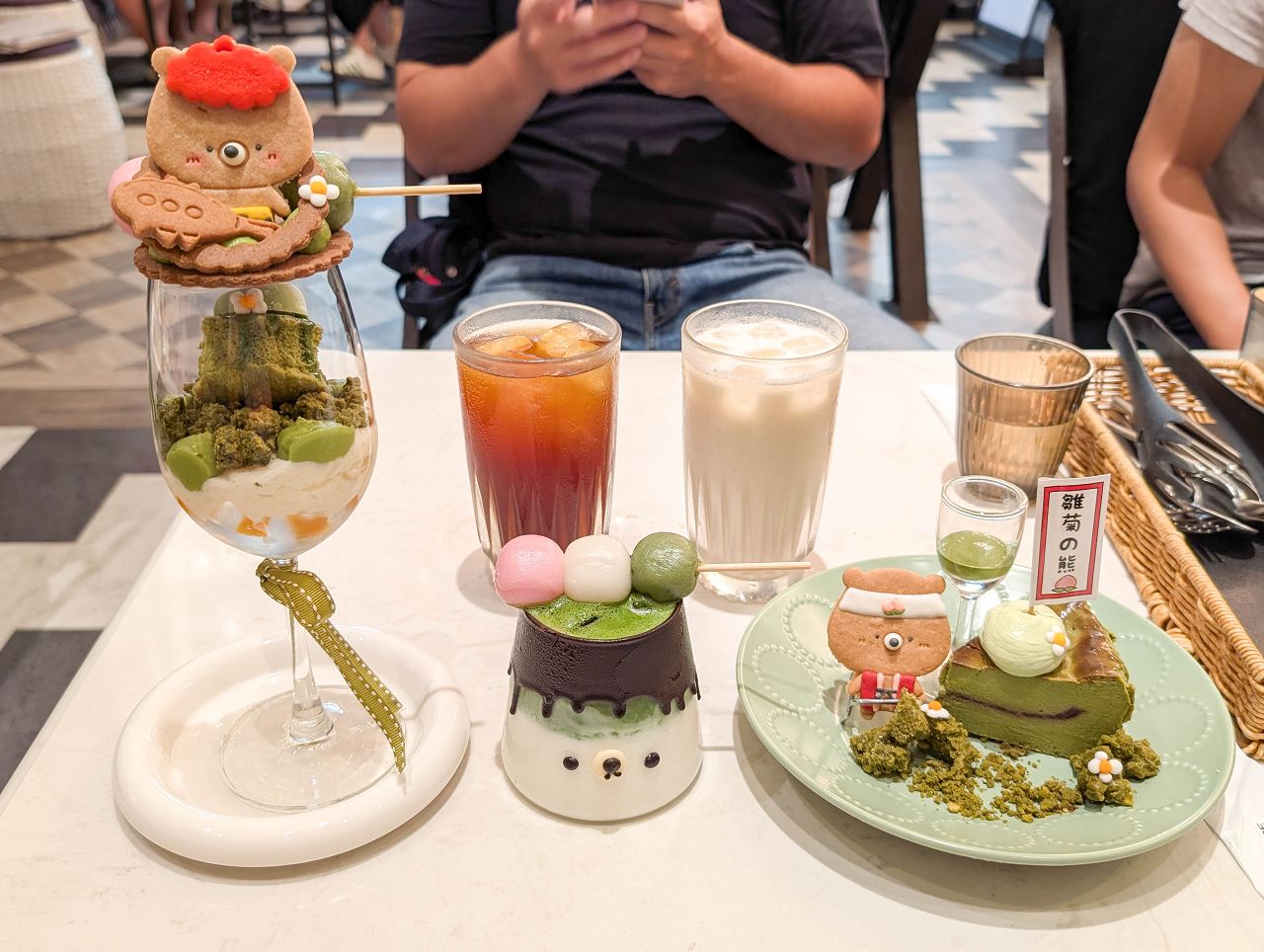 上方擺上手作小熊造型餅乾、抹茶卡士達醬和一串糯米糰子。