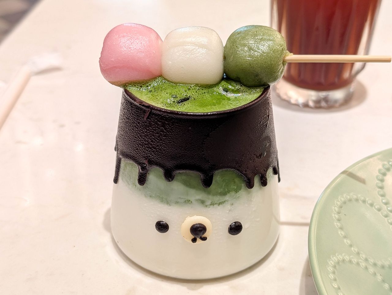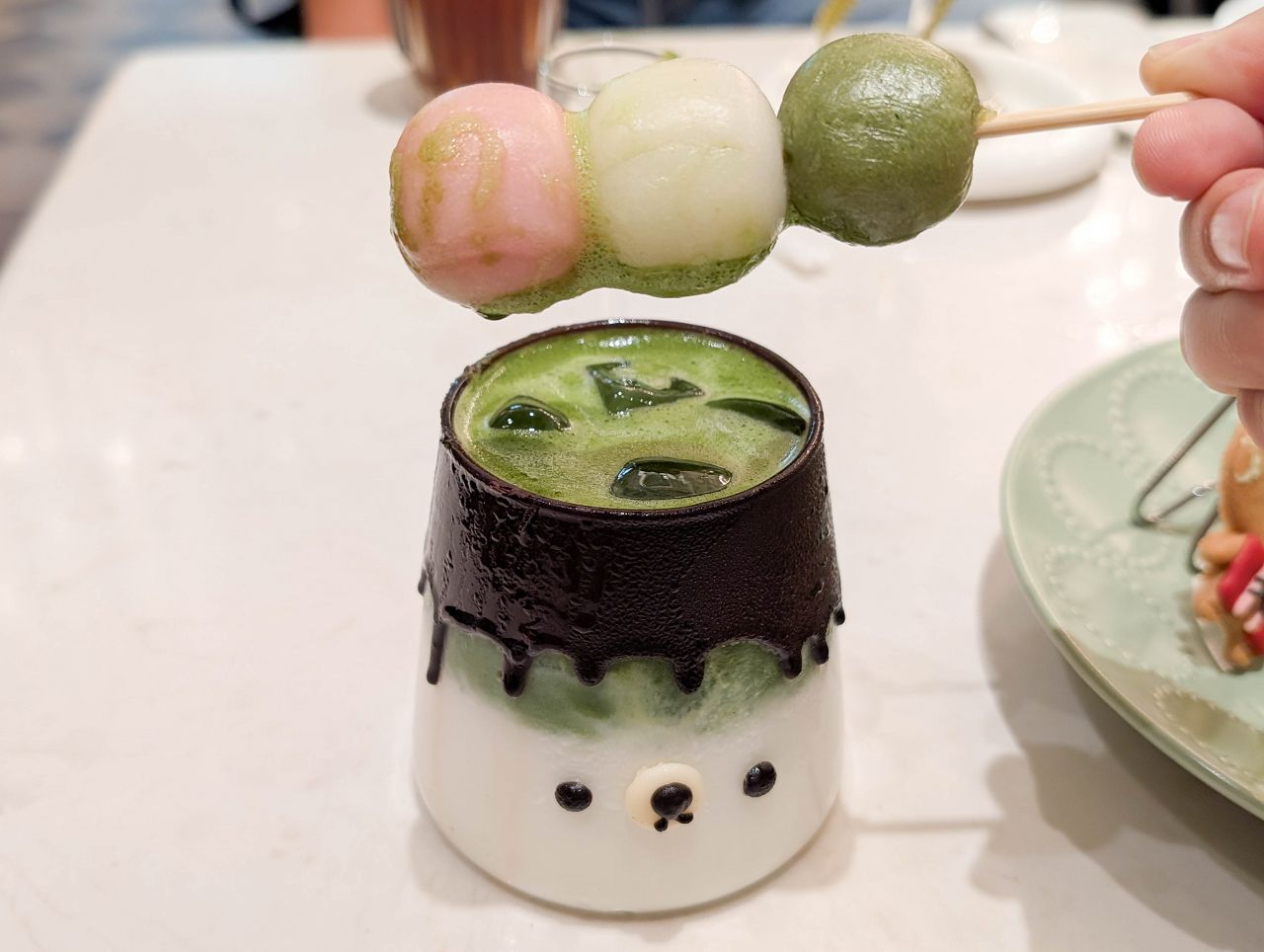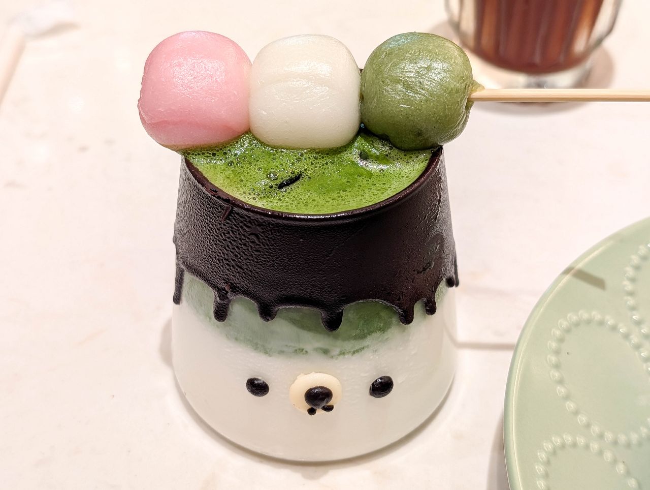 手刷抹茶拿鐵放上一串糯米糰子造型真可愛!