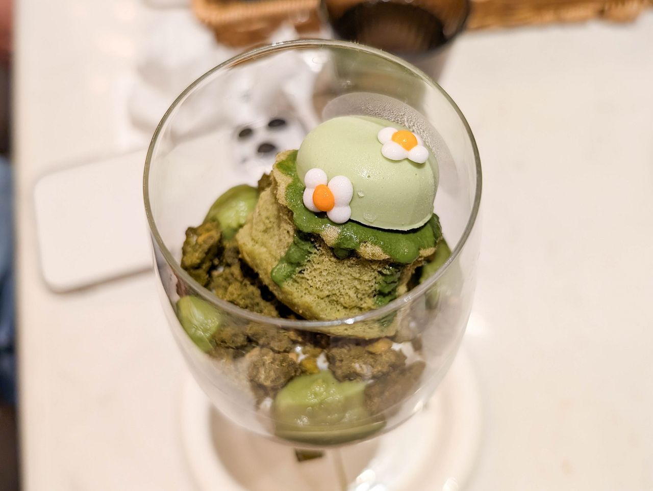 從底下至上依序有橙酒凍、砂糖橘果醬、米布丁、抹茶酥頂、抹茶卡士達醬、抹茶海綿蛋糕、抹茶醬和抹茶慕斯層層堆疊,