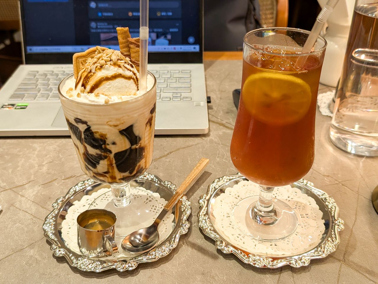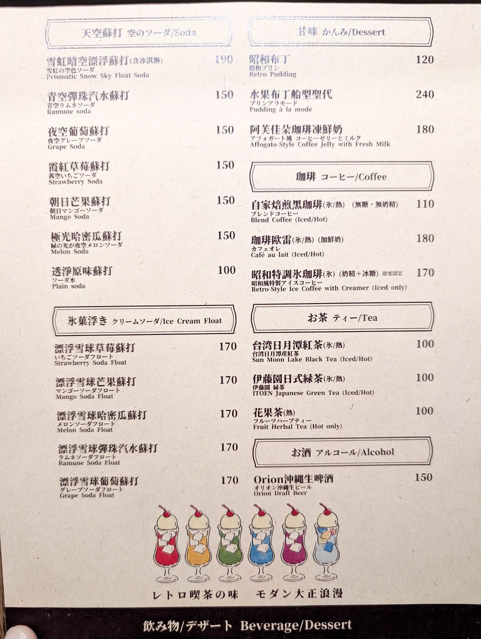 飲品有蘇打、漂浮蘇打、咖啡、茶飲,