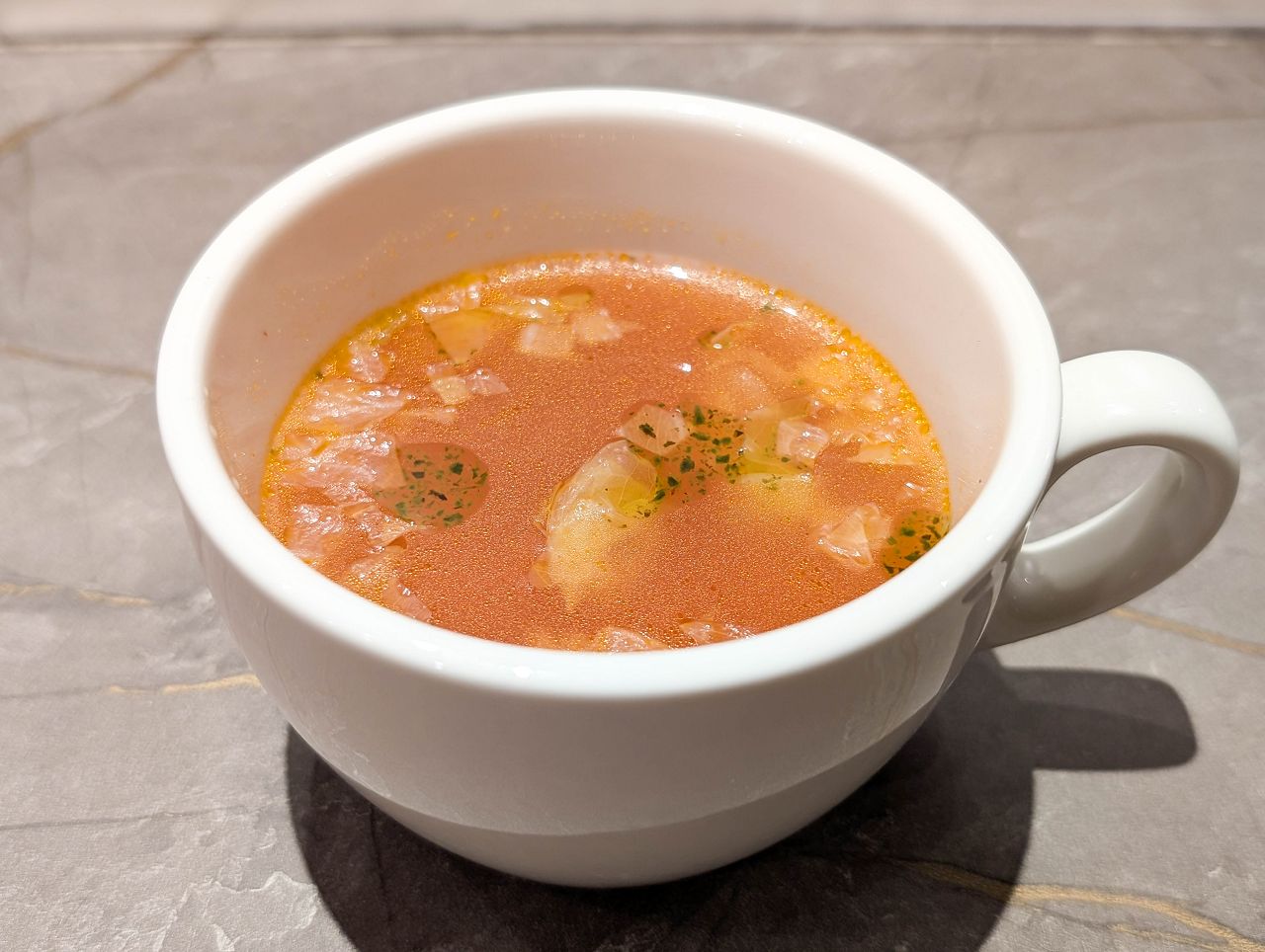 以昆布和柴魚高湯燉煮的厚燒玉子以豬肉薄片包覆,