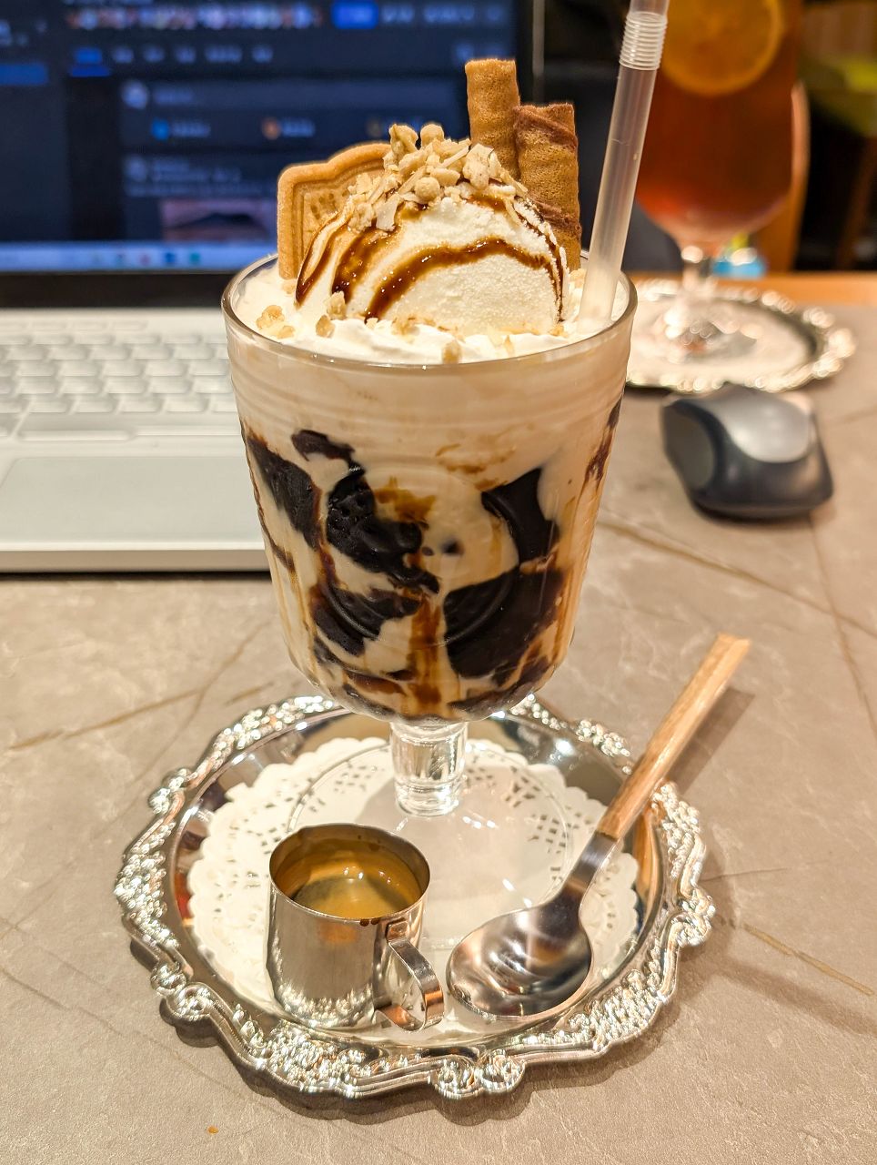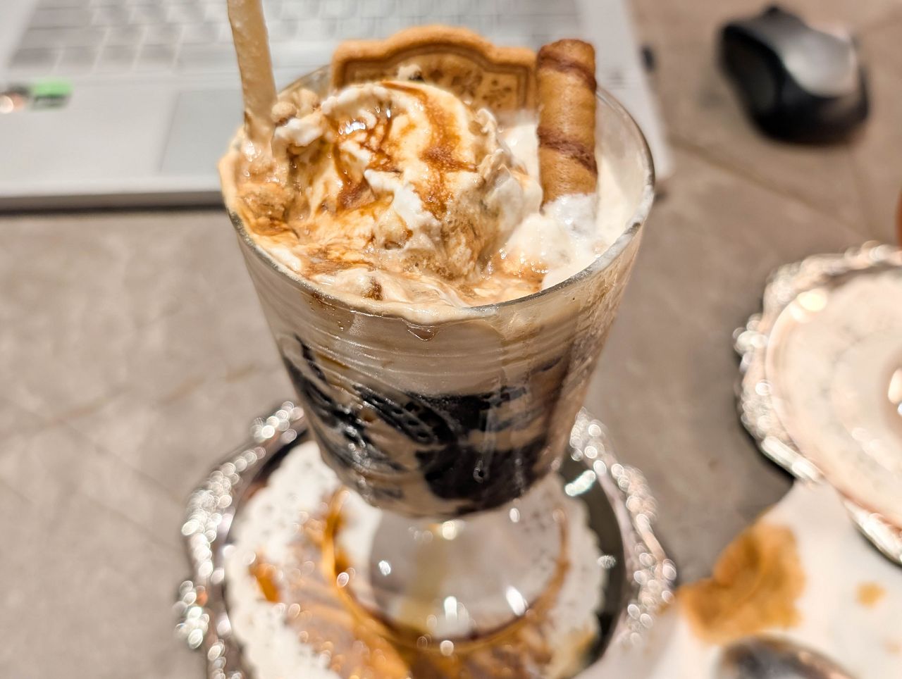咖啡凍鮮奶加上一球香草冰淇淋搭配餅乾,