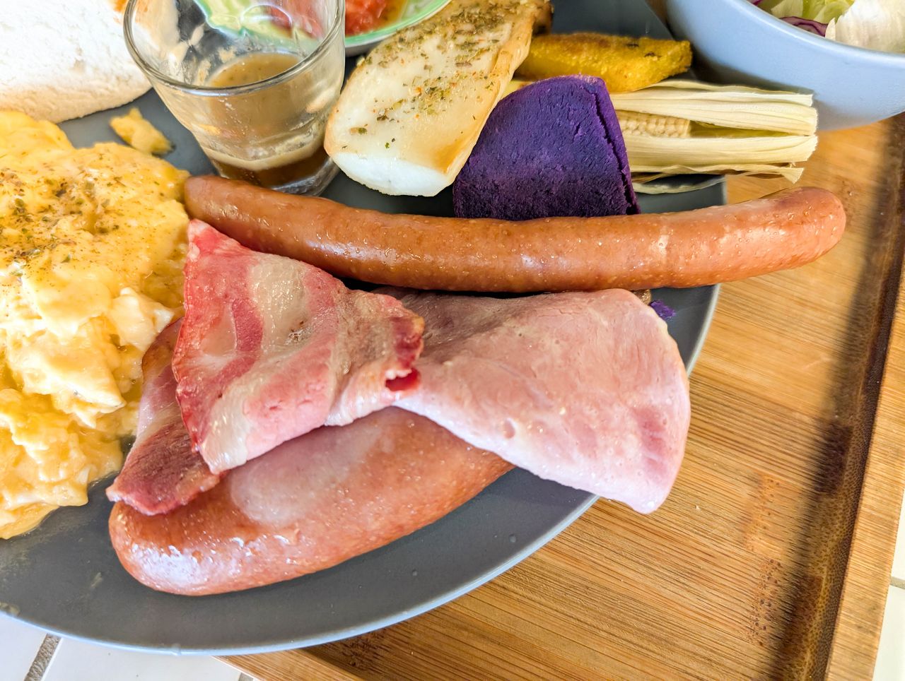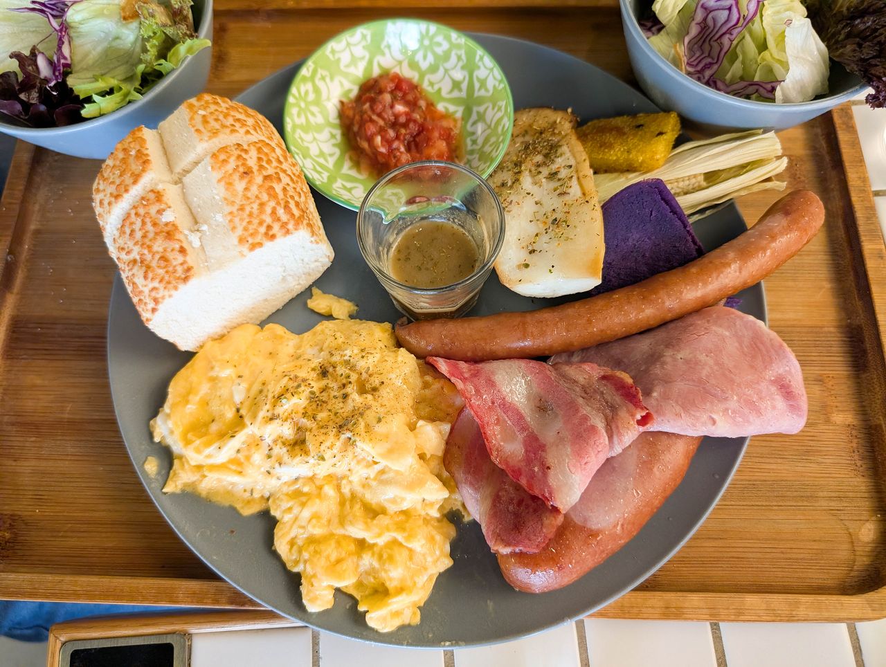 有美式炒蛋、帶骨香腸、德式羊膜香腸、網狀火腿和培根,