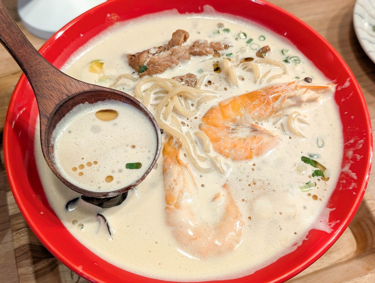 赤蝦味噌湯頭是使用蝦高湯、蝦油大火熬煮而成,