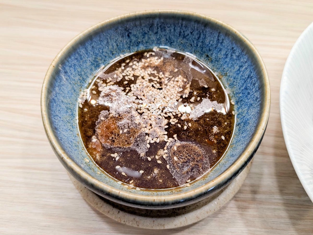 先將金桔、檸檬擠一些汁到沾麵湯汁裡,