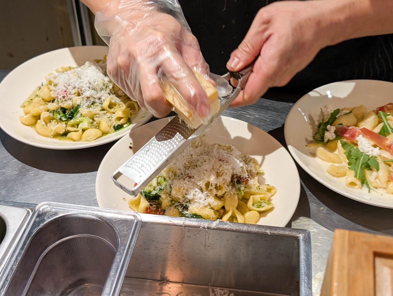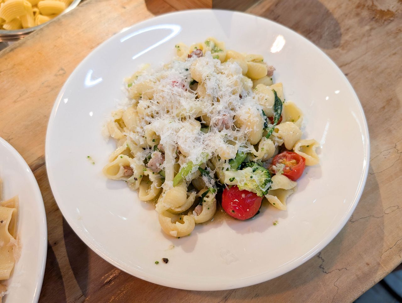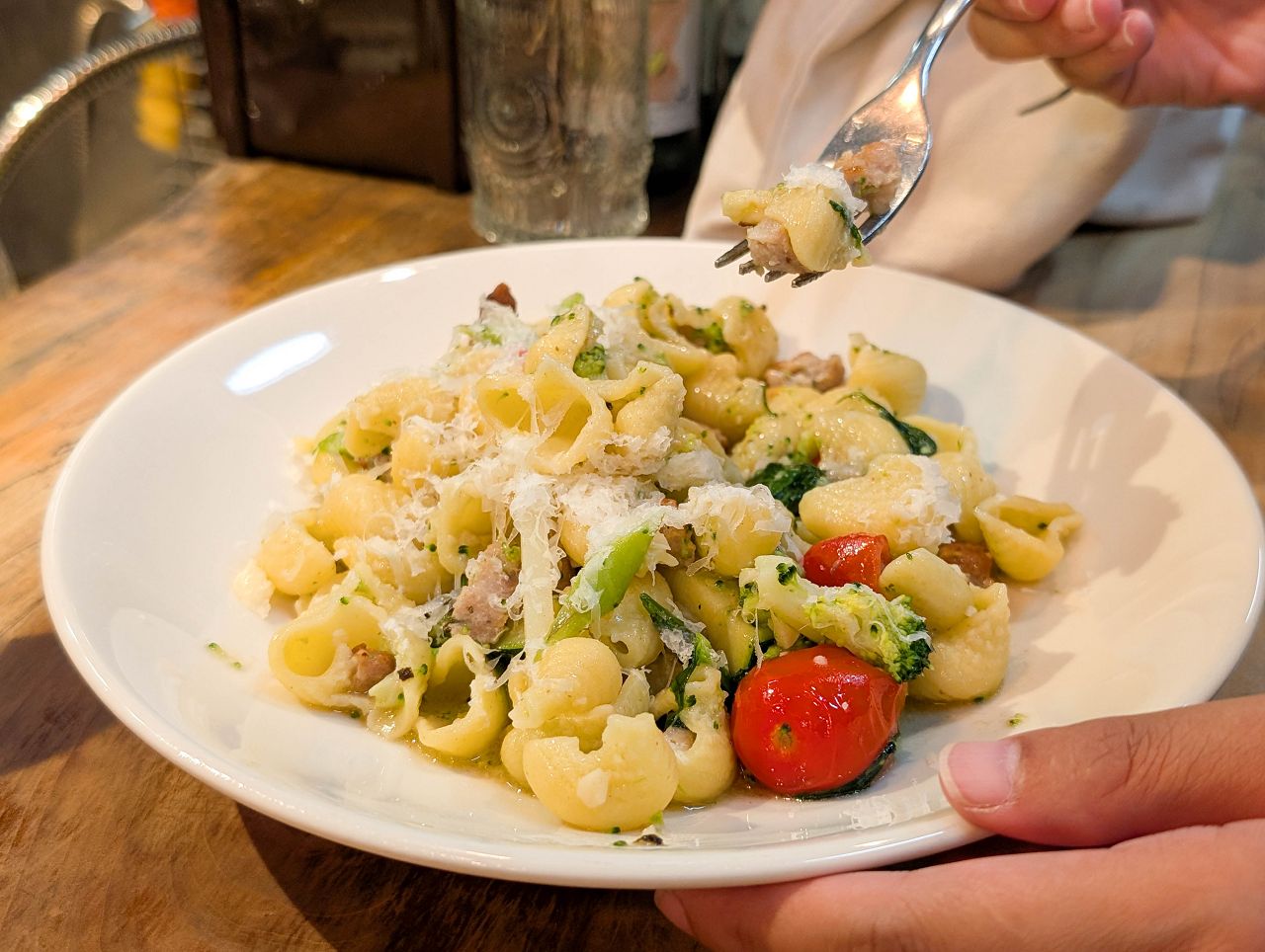 貝殼麵搭配義式肉腸、青花菜、小番茄等以橄欖油清炒,