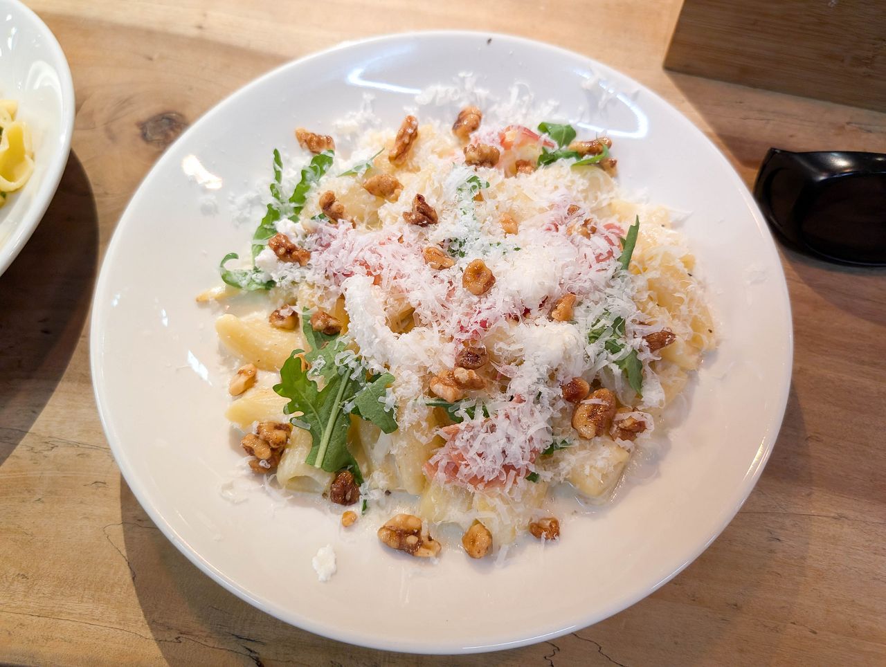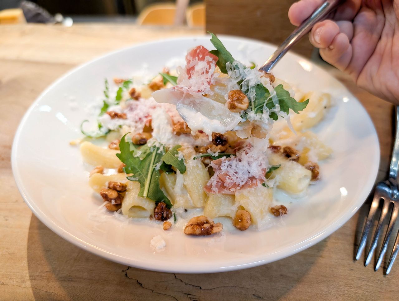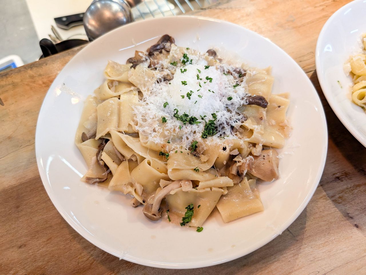 特寬麵爬著滿滿濃郁的奶油醬汁,
