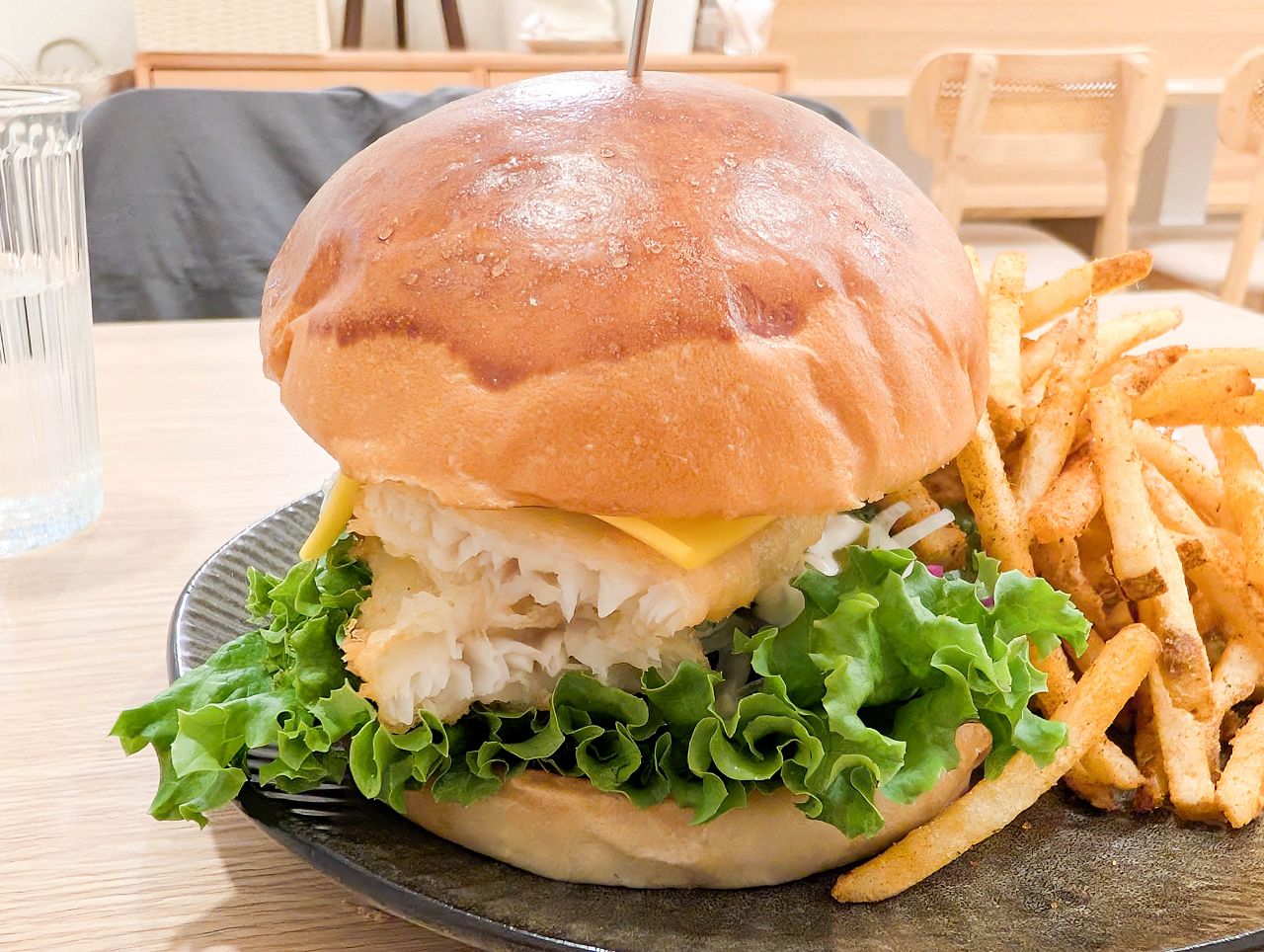 漢堡麵包夾著英式炸魚排、起司、生菜、洋蔥、酸黃瓜、蒔蘿酸奶醬,