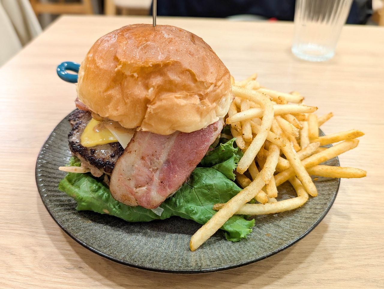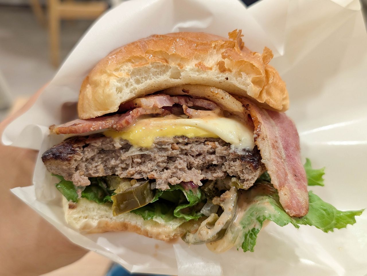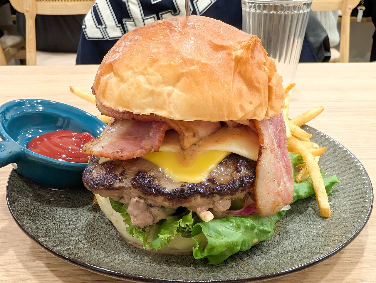 漢堡麵包夾入手作牛肉漢堡排、培根、雙起司、BBQ煙燻醬、洋蔥、酸黃瓜、墨西哥辣椒等,