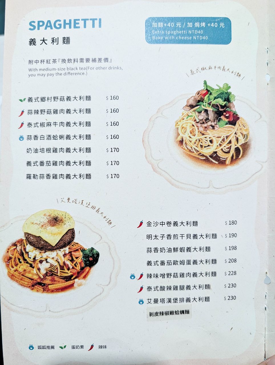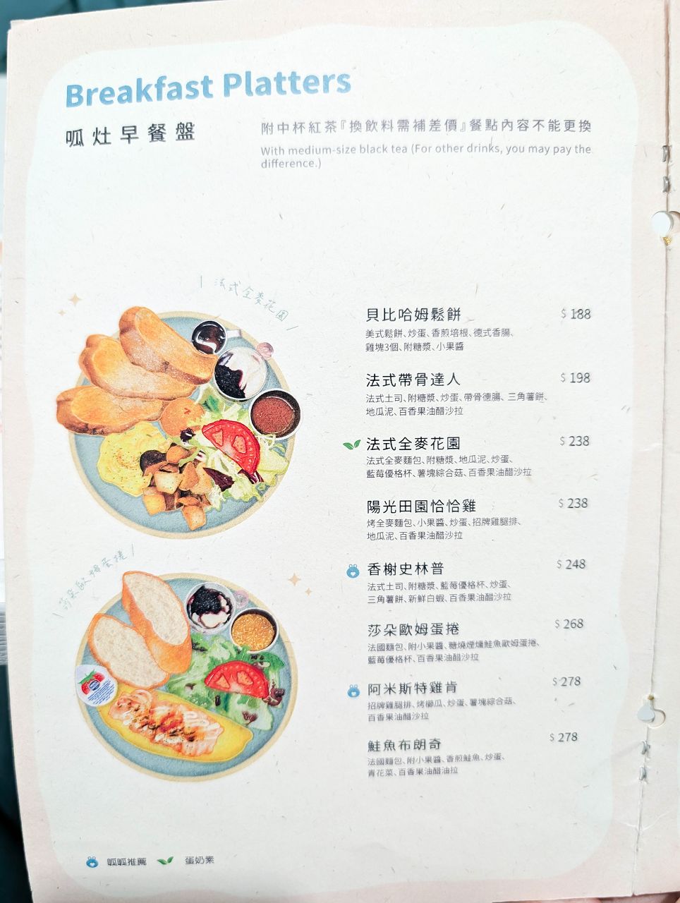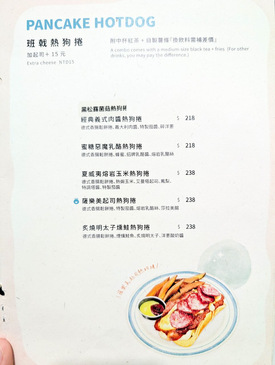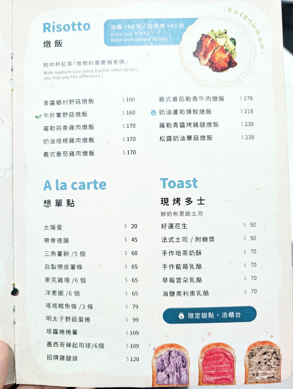有拼盤式早午餐、熱狗堡、漢堡、義大利麵、燉飯等,