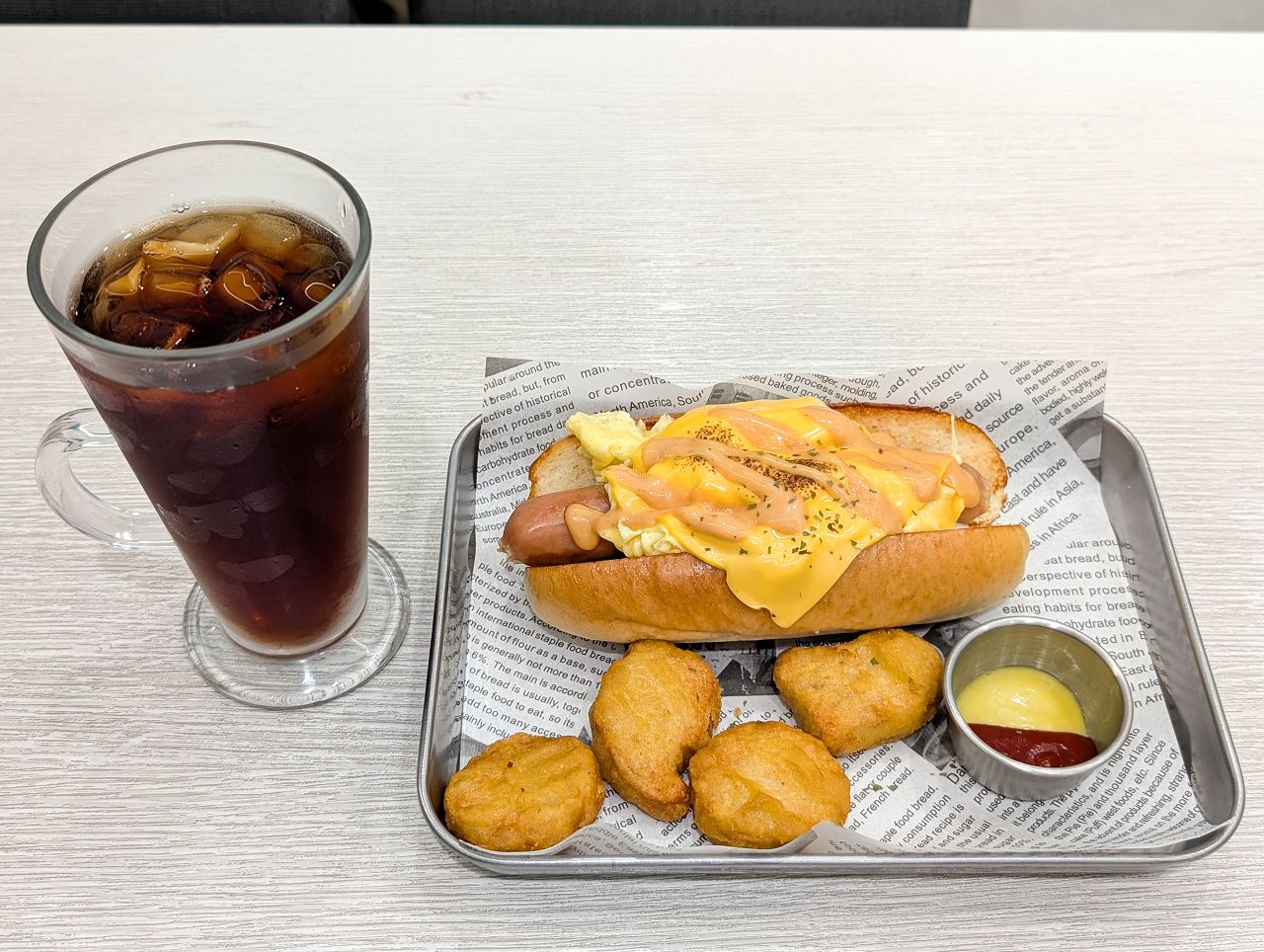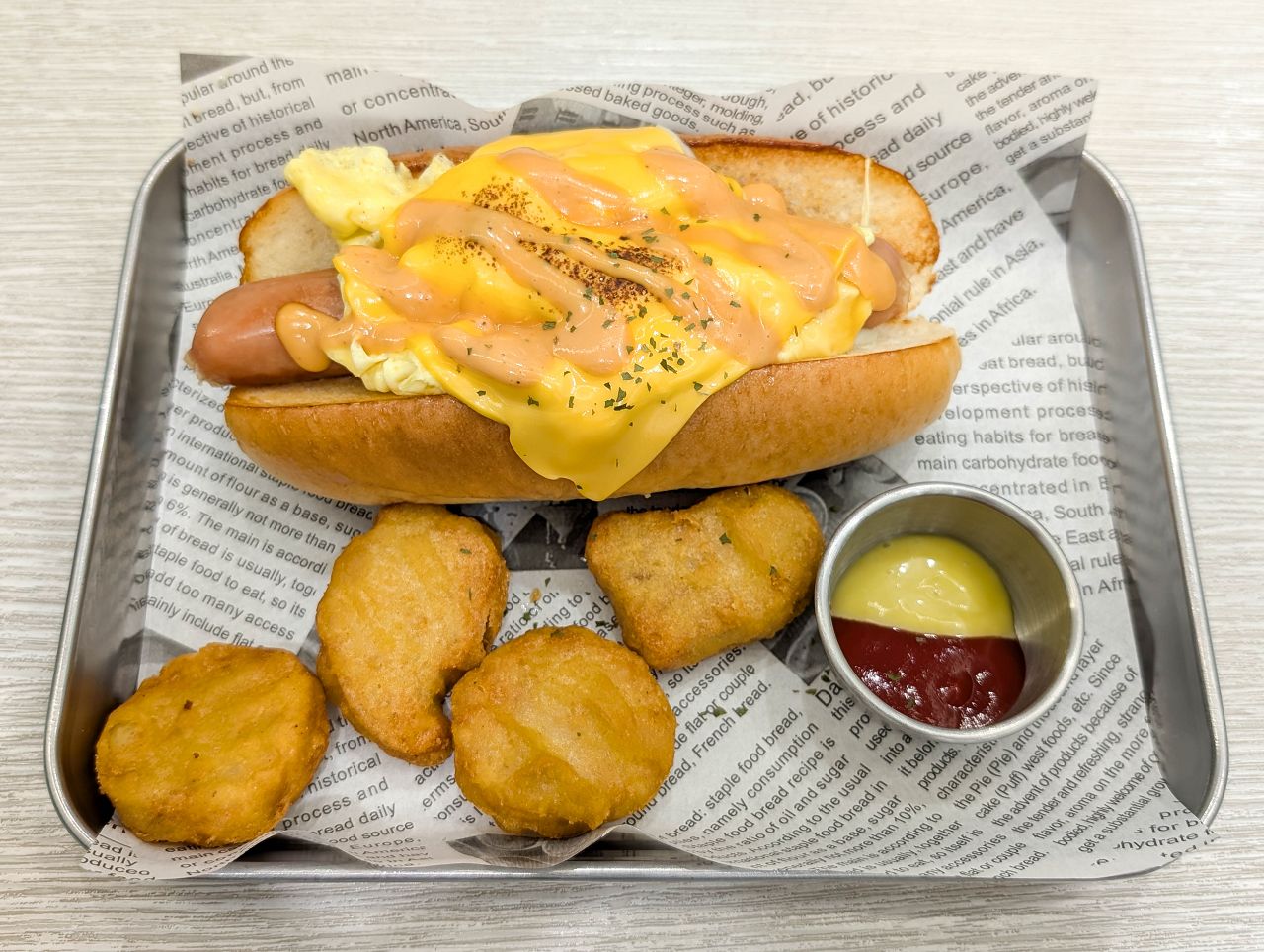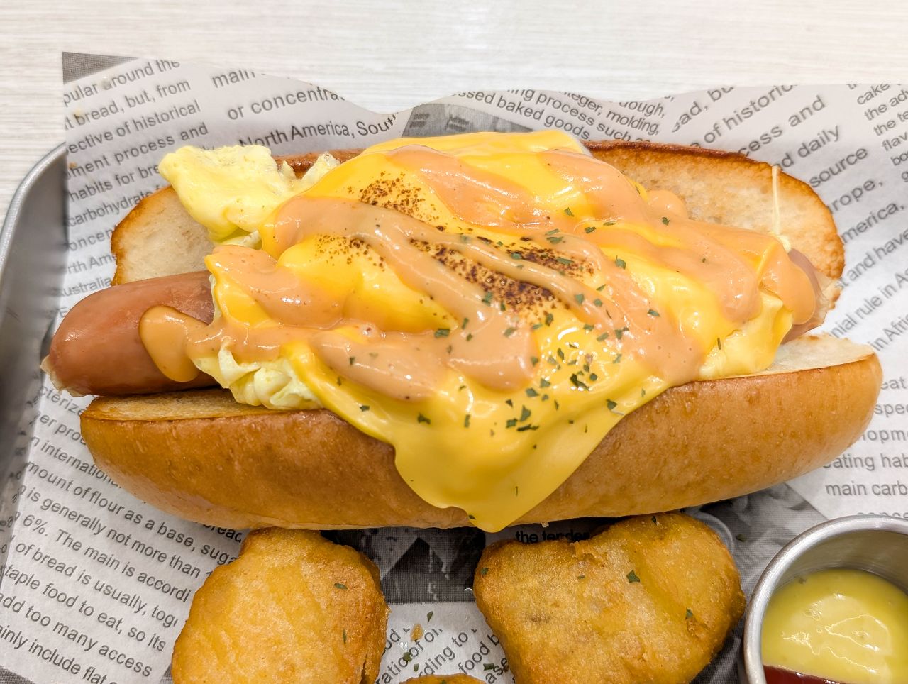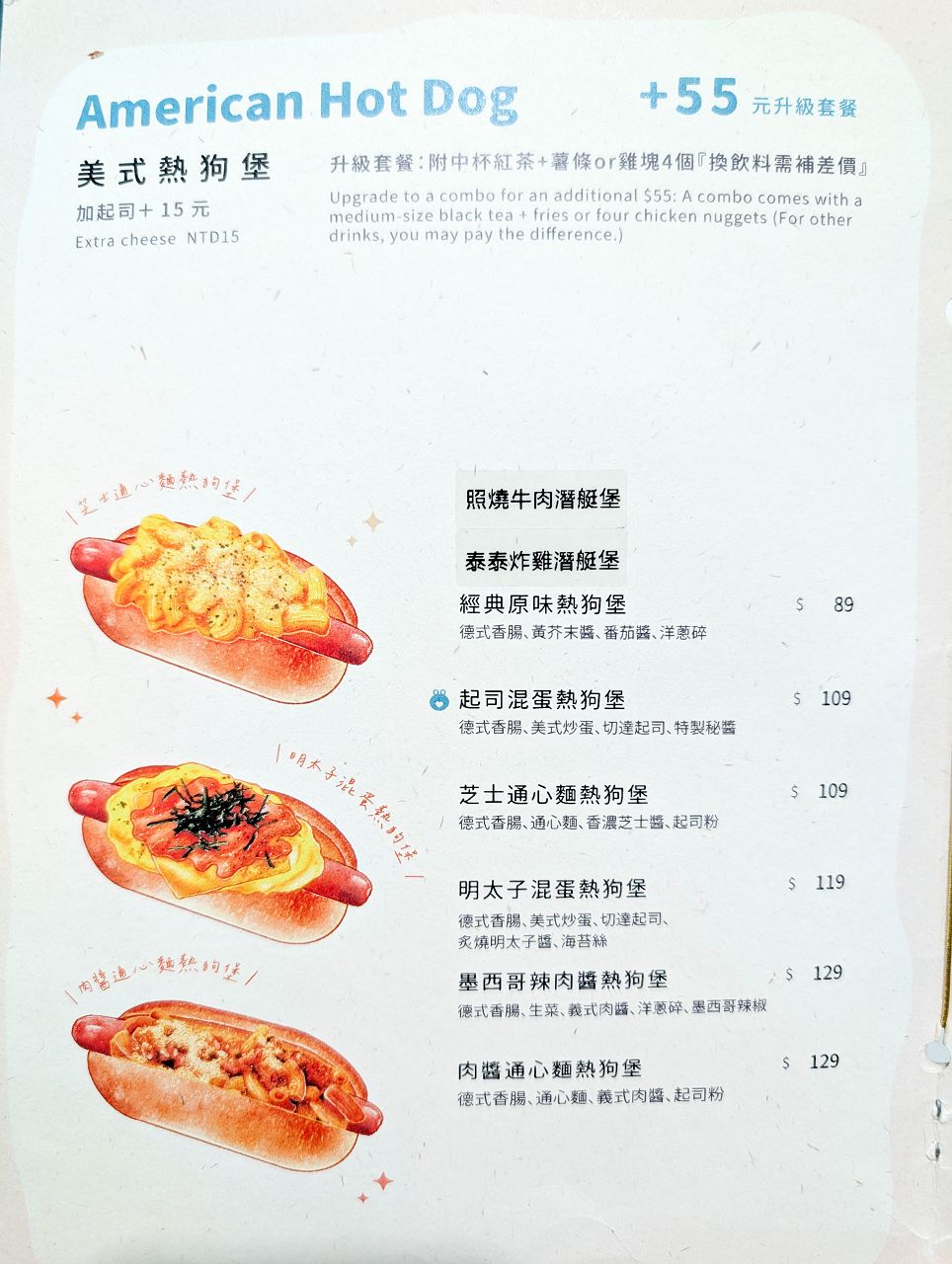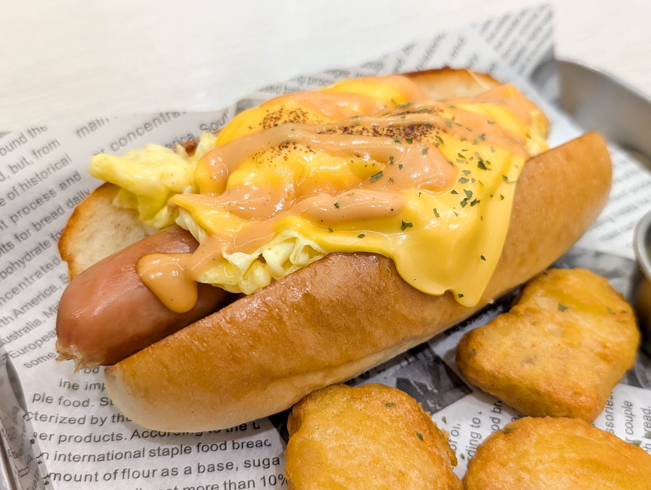 麵包夾著熱狗、美式炒蛋、切達起司、特製秘醬,
