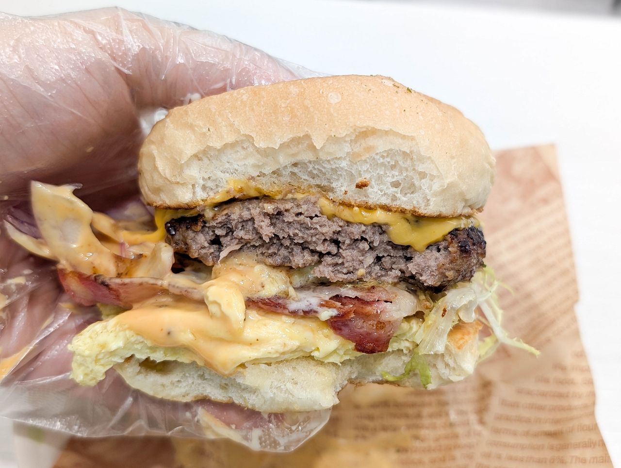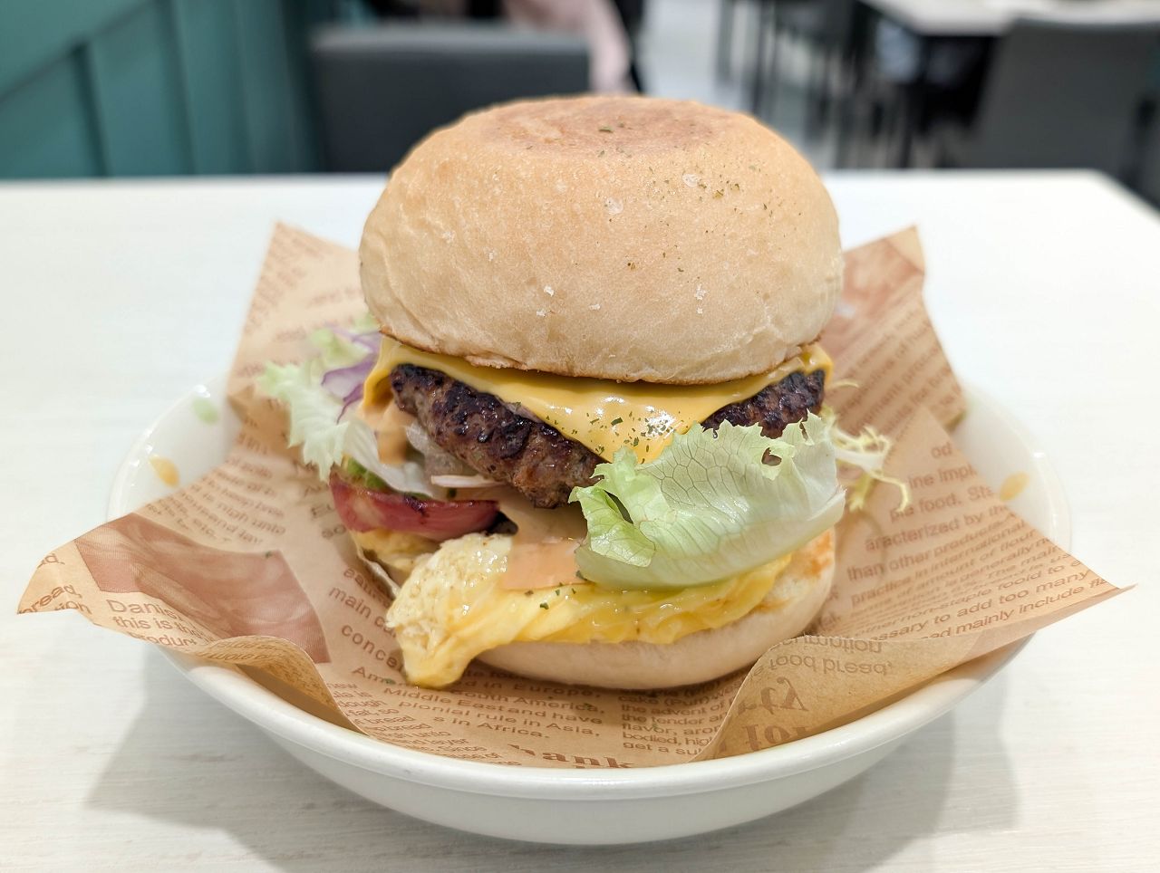 漢堡麵包夾著手打牛肉漢堡排、炒蛋、培根、切達起司、生菜、洋蔥、特調醬等,