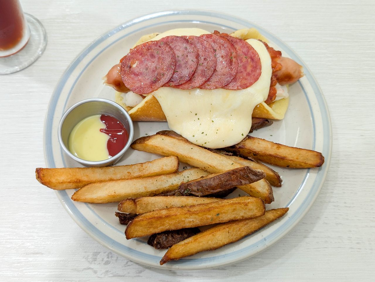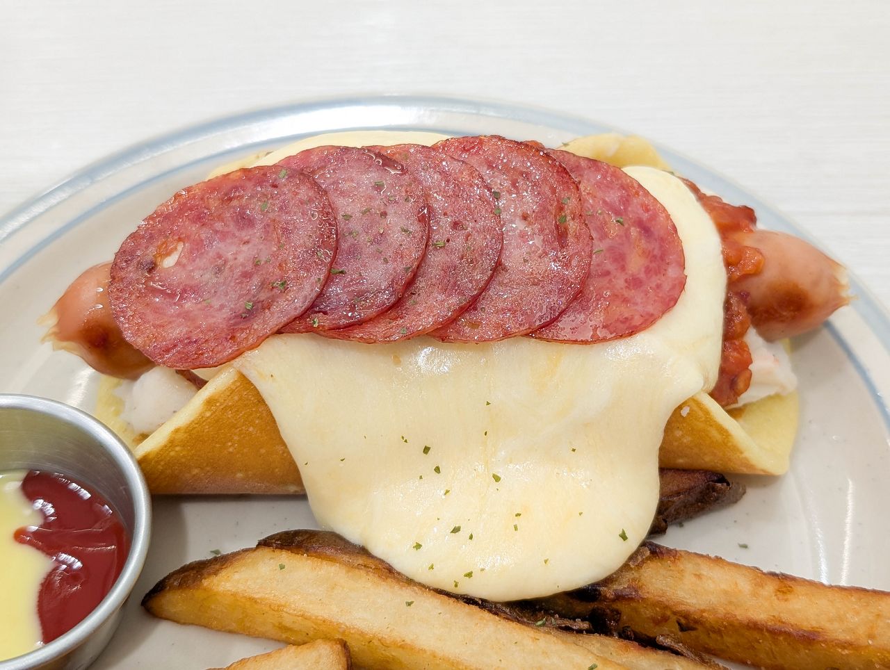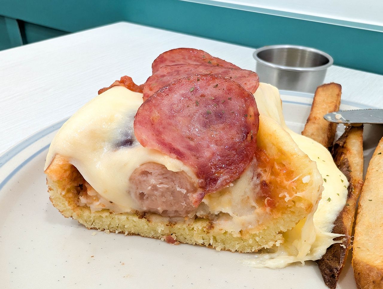 這款還搭配熔岩乳酪絲、特製茄醬和切片薩拉美腸。