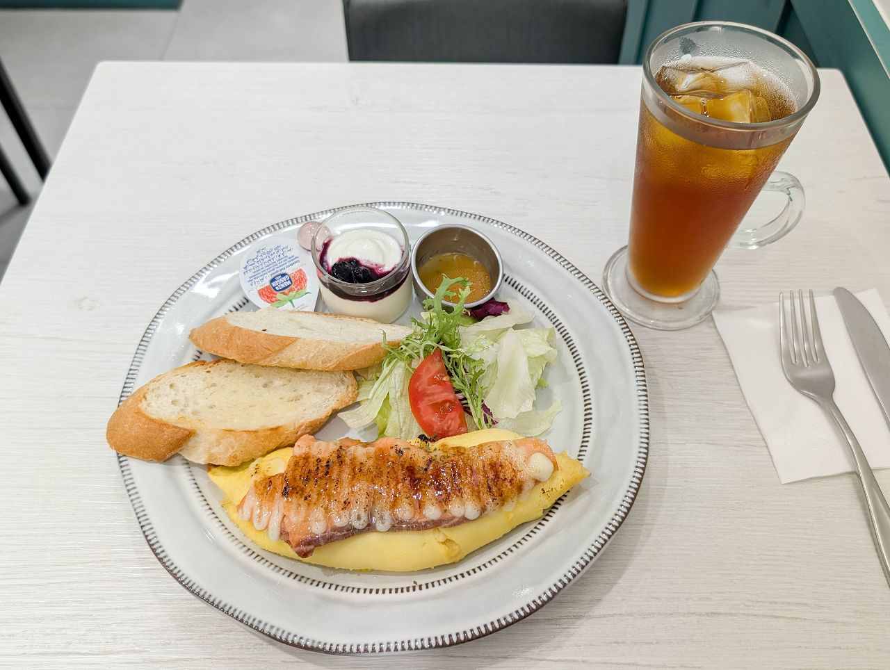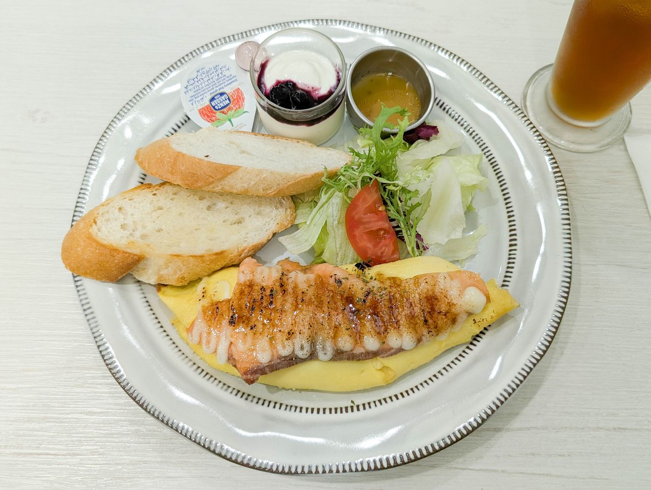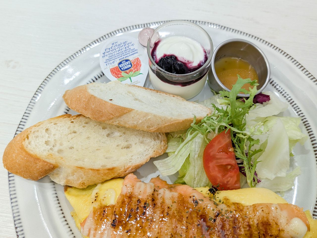 附上沙拉、法國麵包、藍莓優格杯,