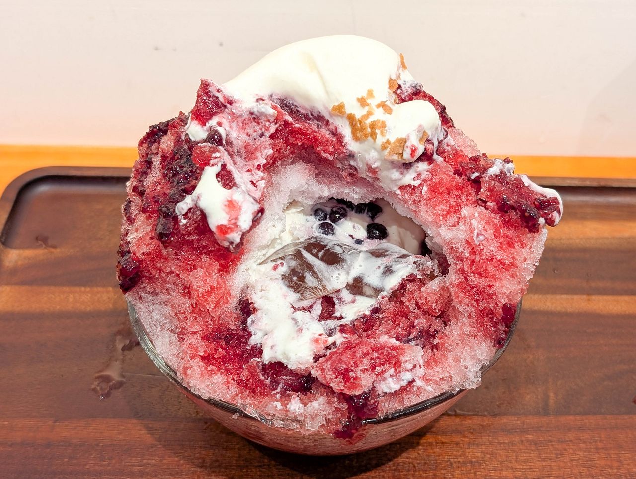 綜合莓果刨冰搭配藍莓、招牌乳酪醬、紅玉紅茶凍、脆餅,