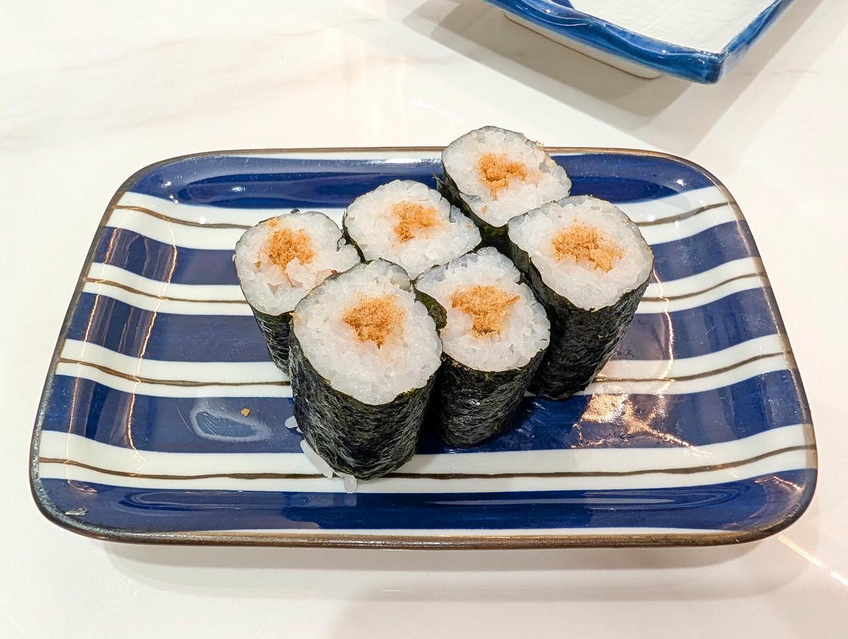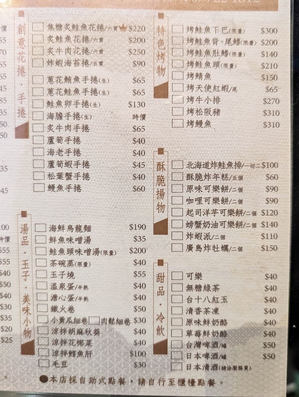這家供應的餐點主要有握壽司、炙燒壽司、生魚片、生食丼飯、熟食丼飯、軍艦壽司、花捲壽司、手捲、烤物、炸物、湯品、小菜、甜點、飲品等,