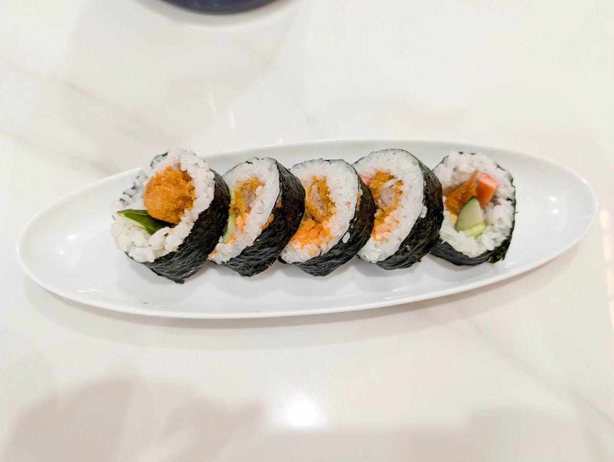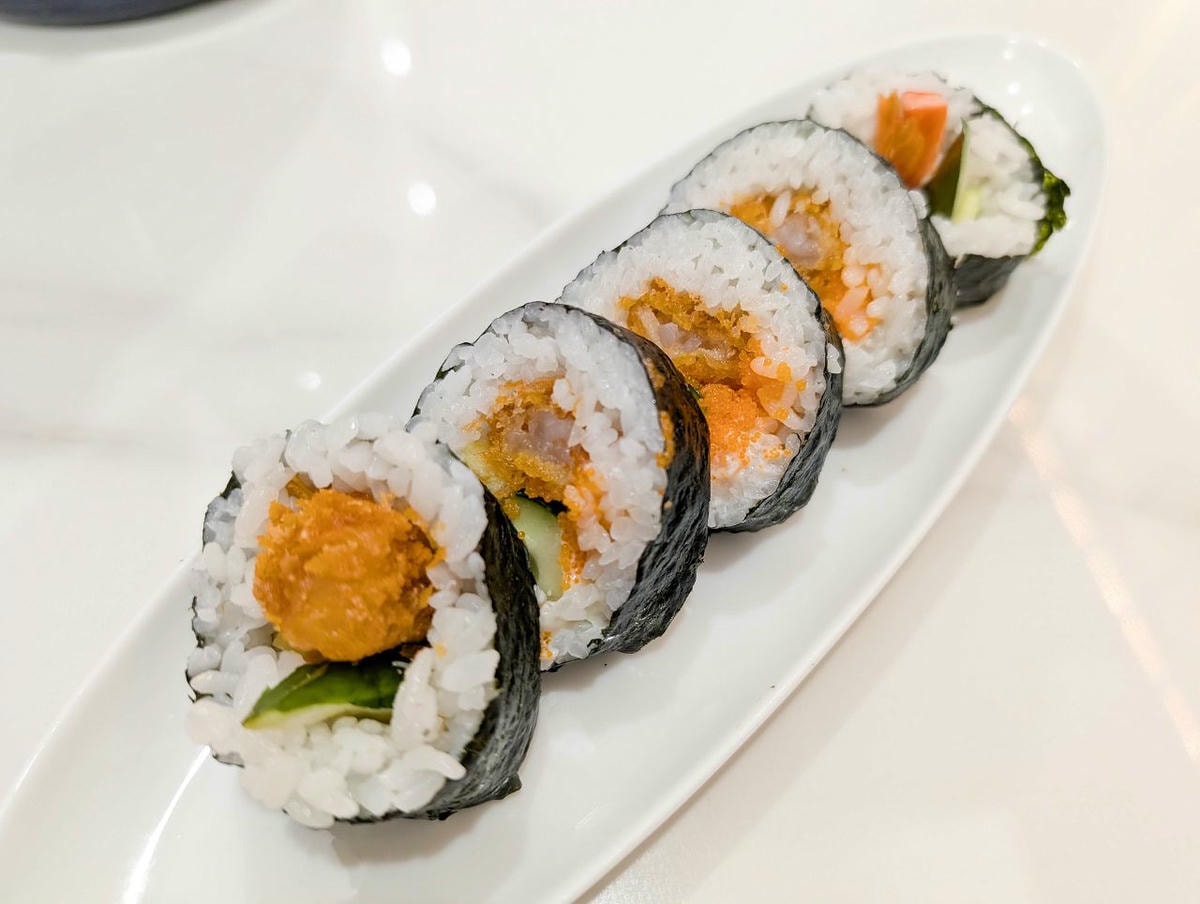 海苔壽司包入炸蝦、蝦卵、小黃瓜、蛋、蟹味棒等,