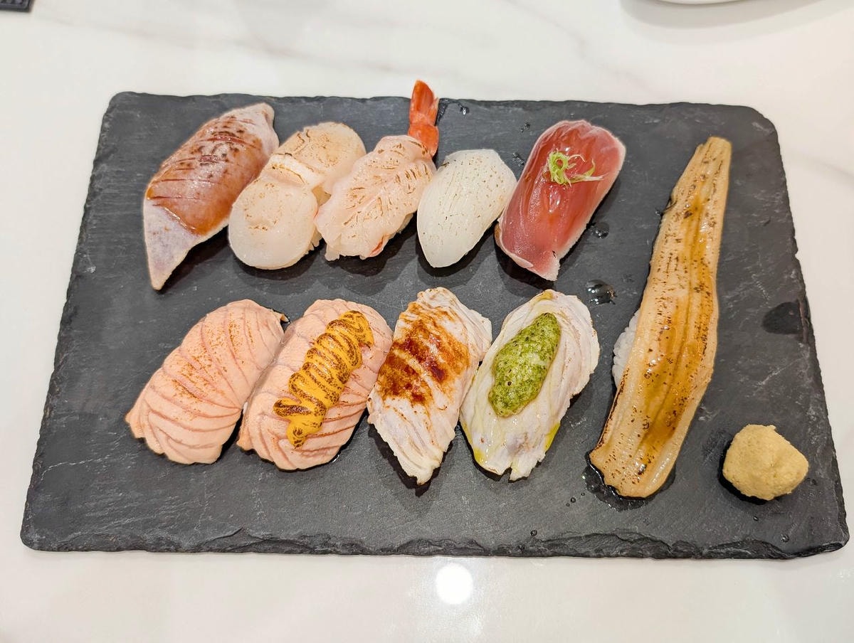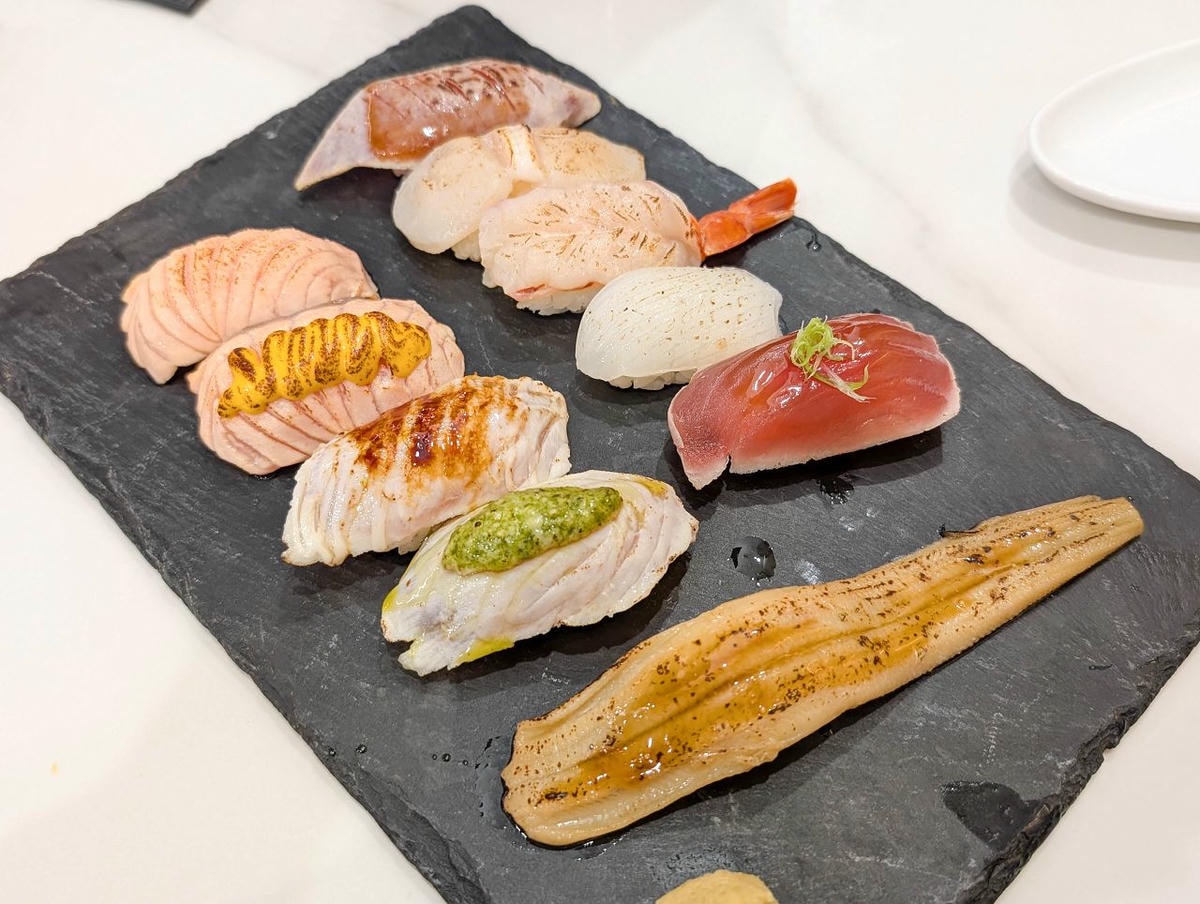 有炙燒鮭魚、鮪魚、星鰻、鮮蝦、旗魚、干貝、花枝等,