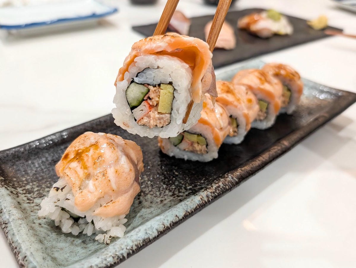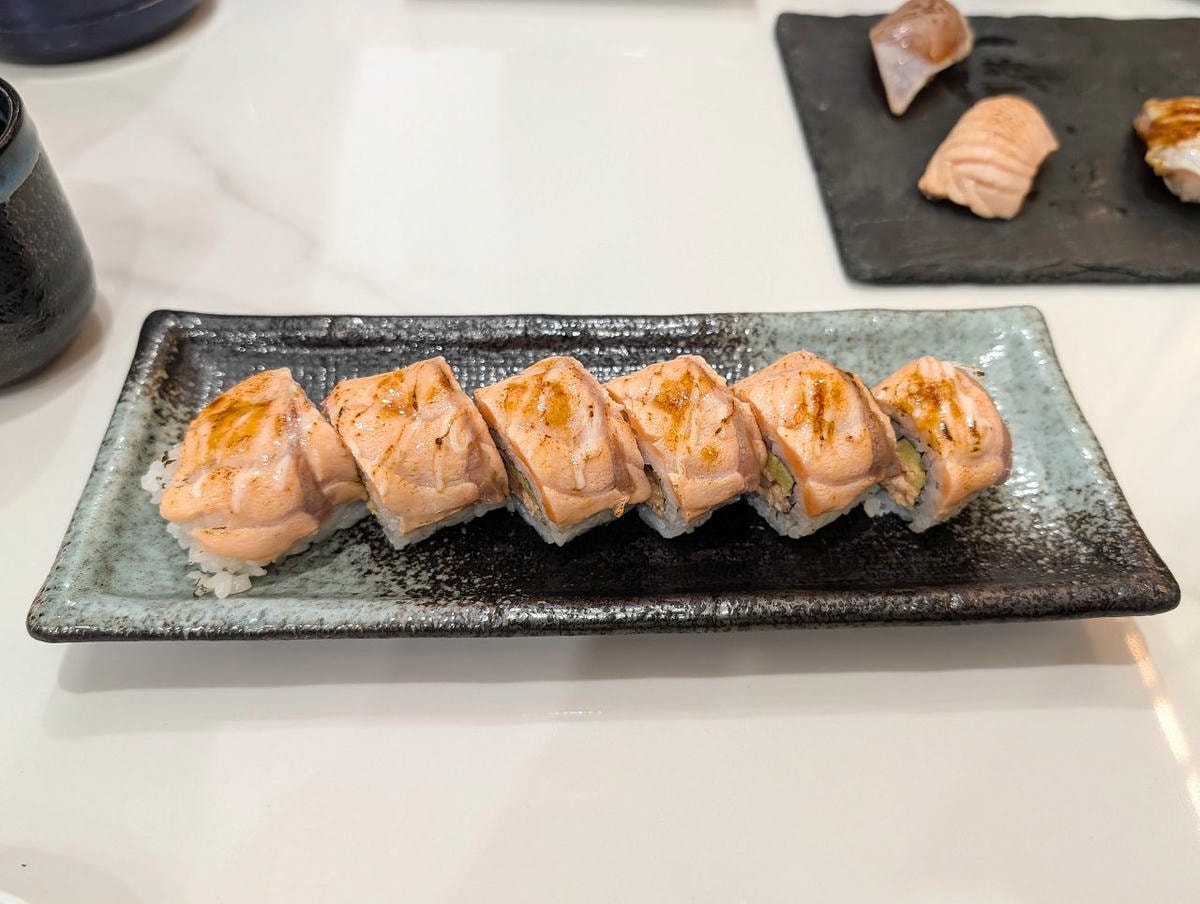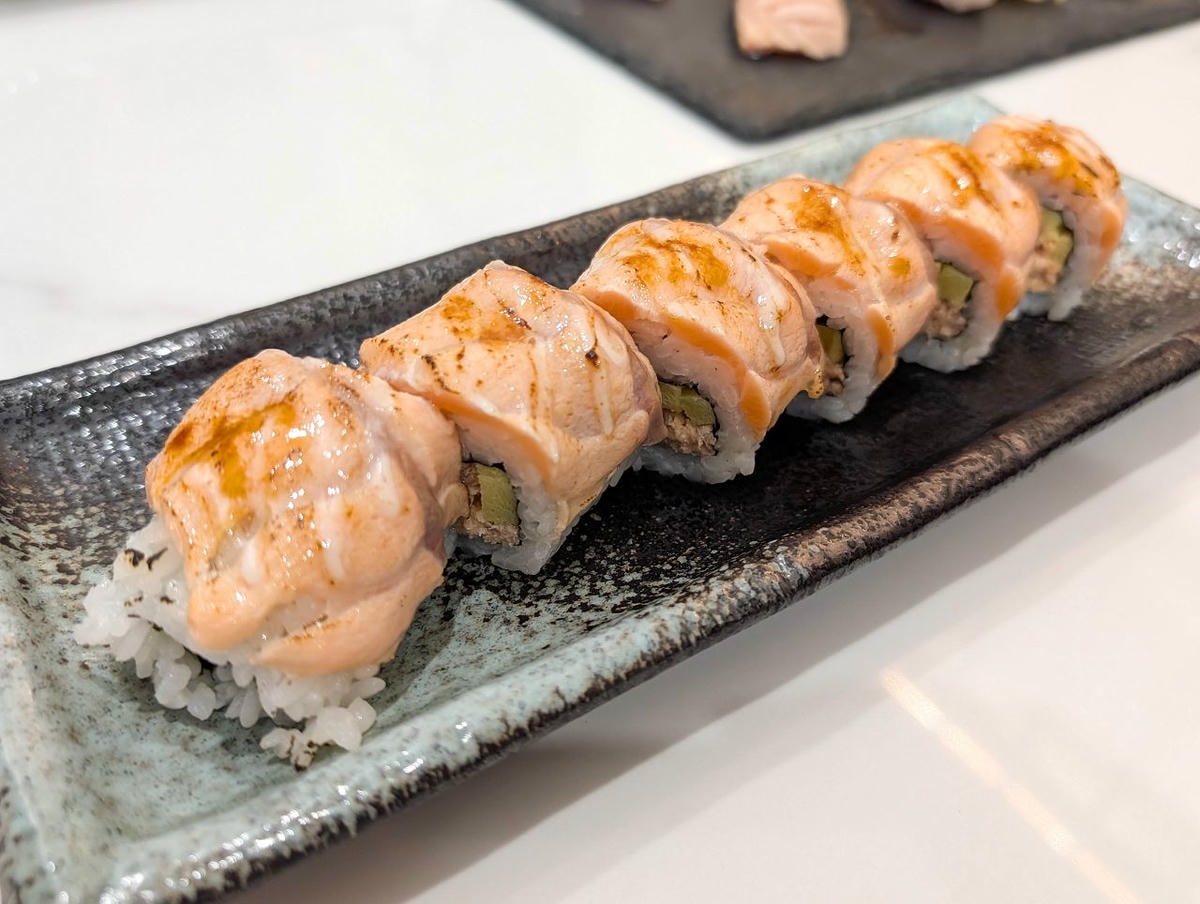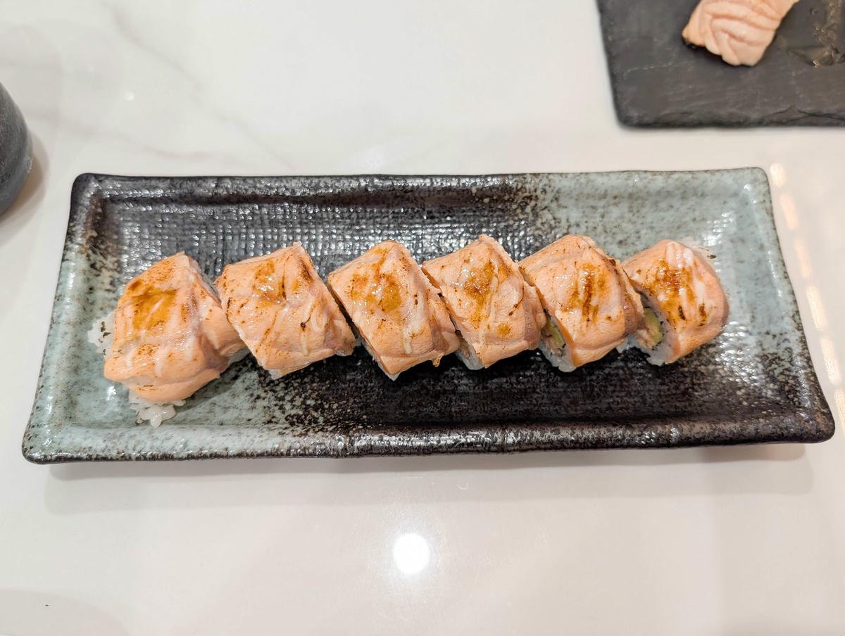 捲壽司以柔嫩鮮美的炙燒鮭魚包覆,
