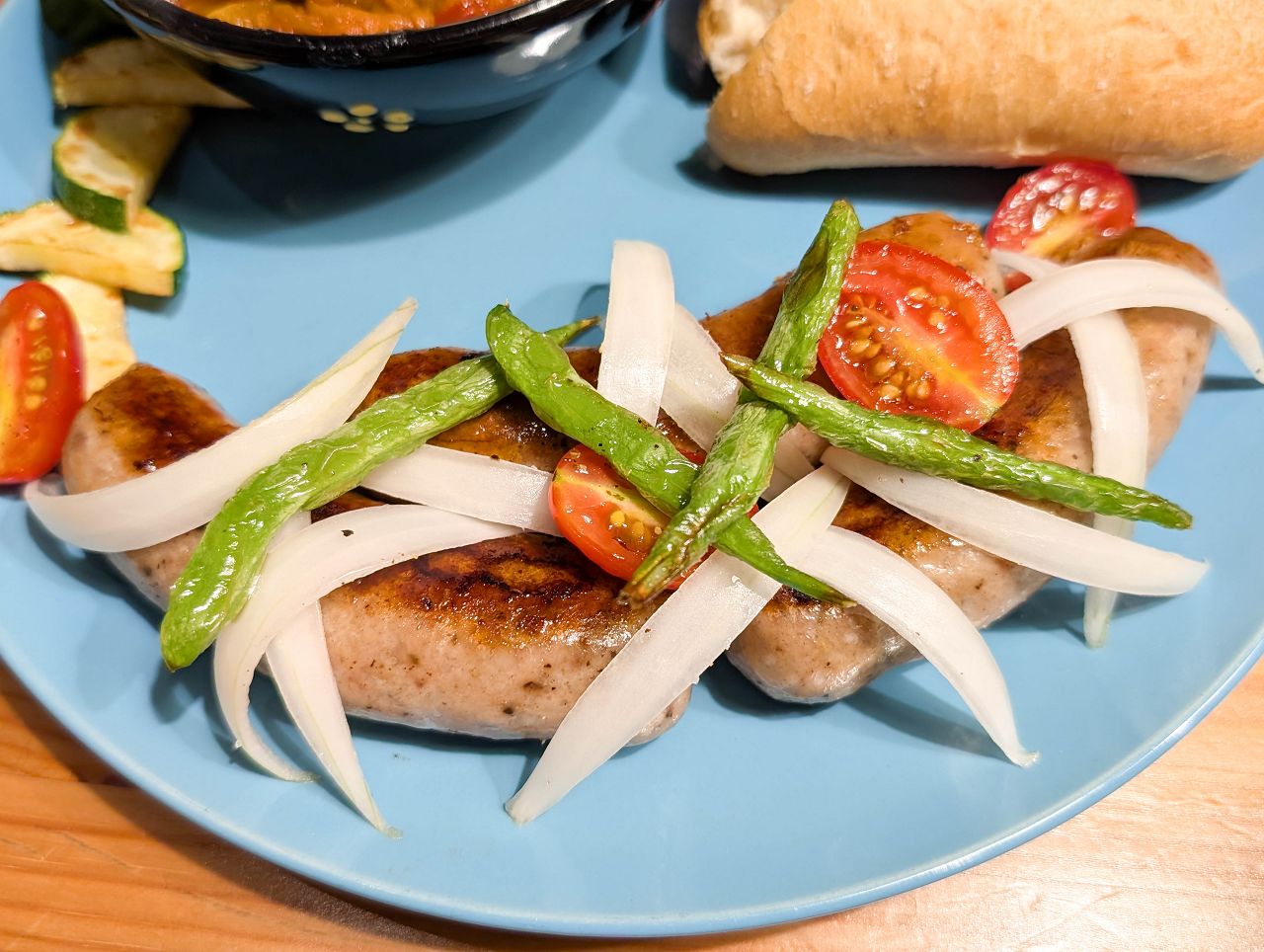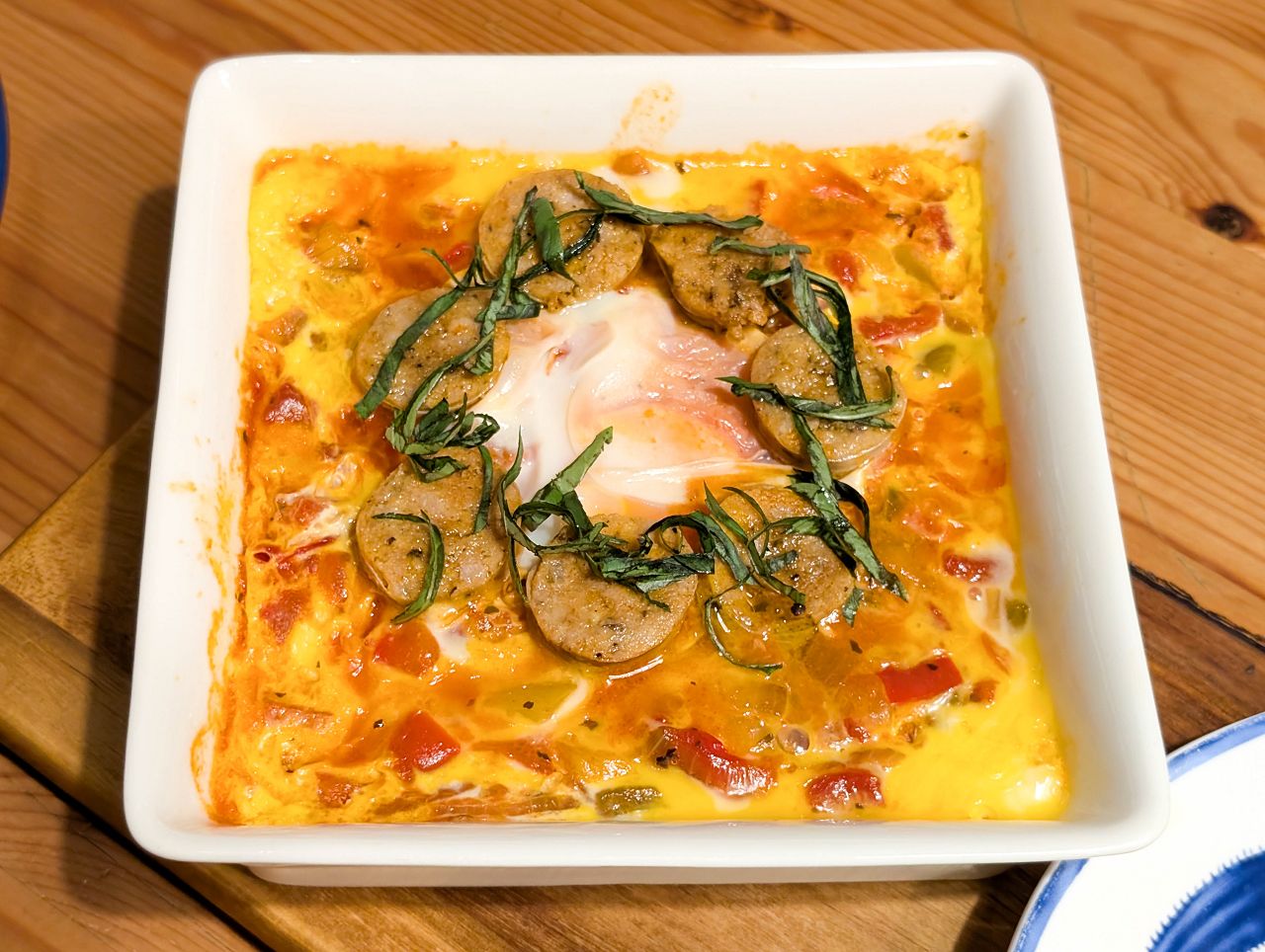 搭配番茄、彩椒等時蔬以及切片肉腸一起燉煮。