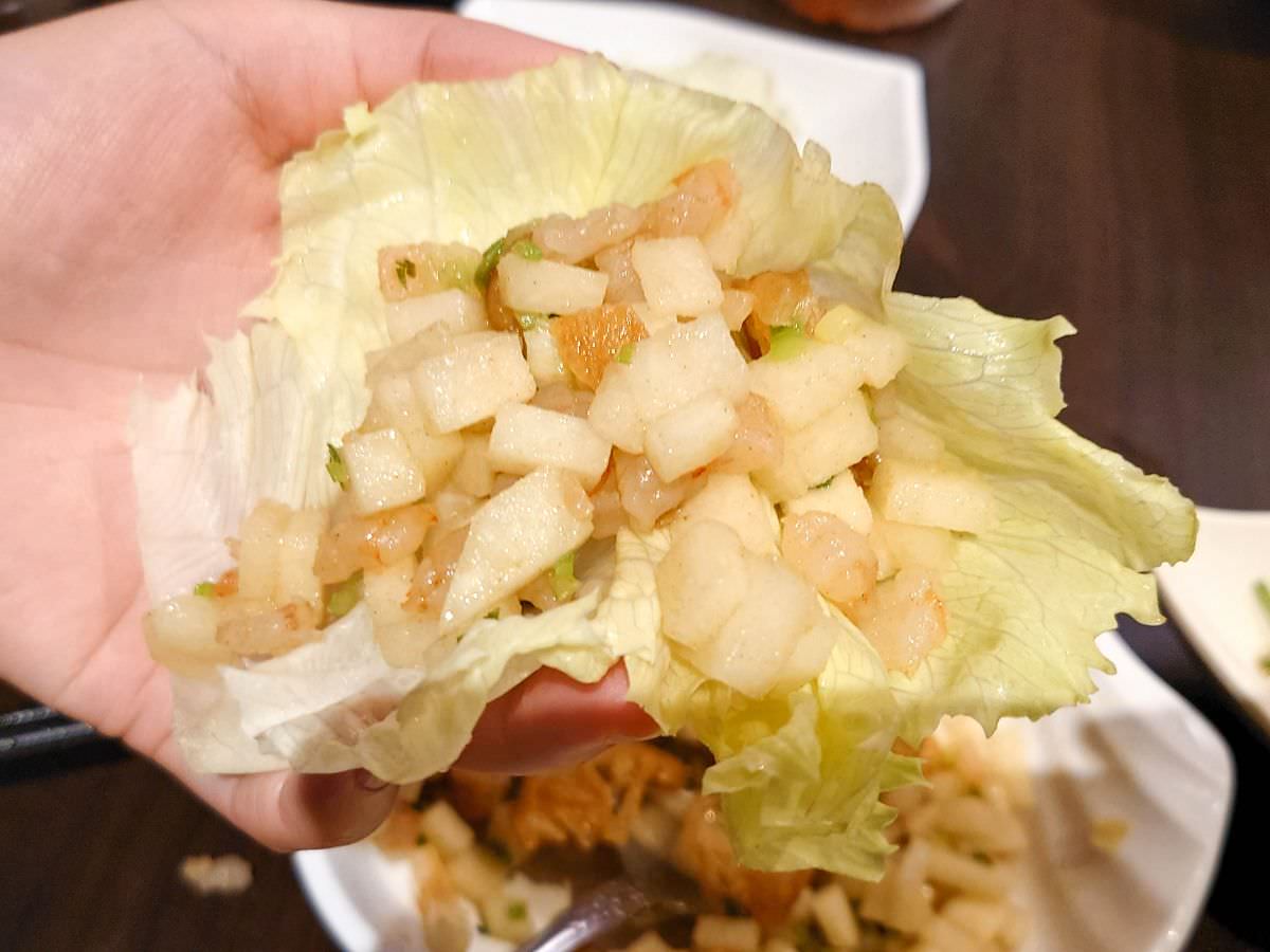 Q彈蝦子、酥脆的油條和脆口的荸薺以生菜包著,