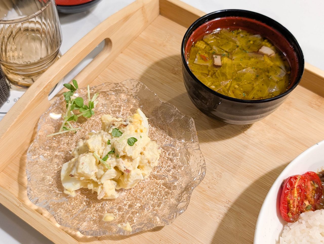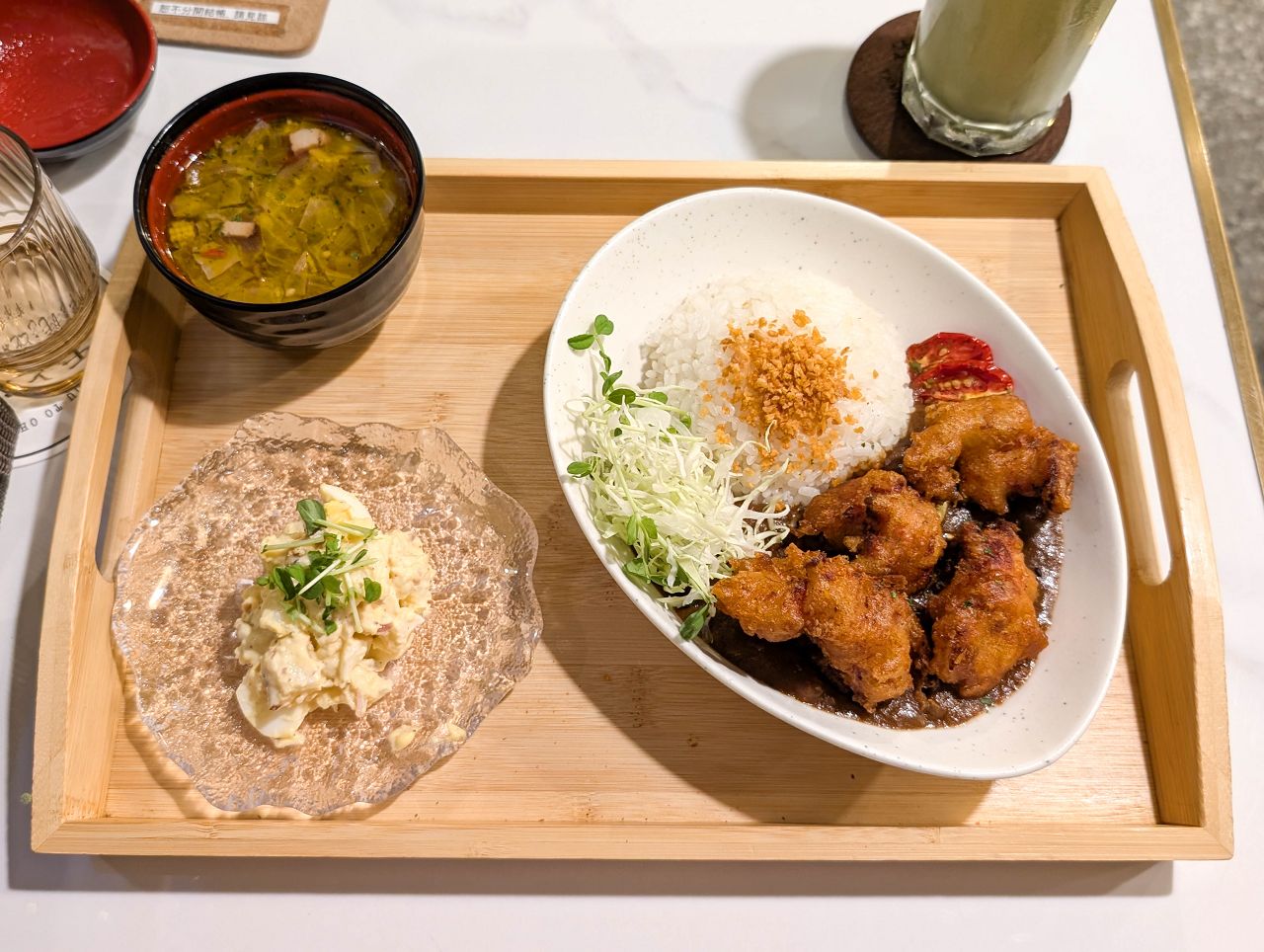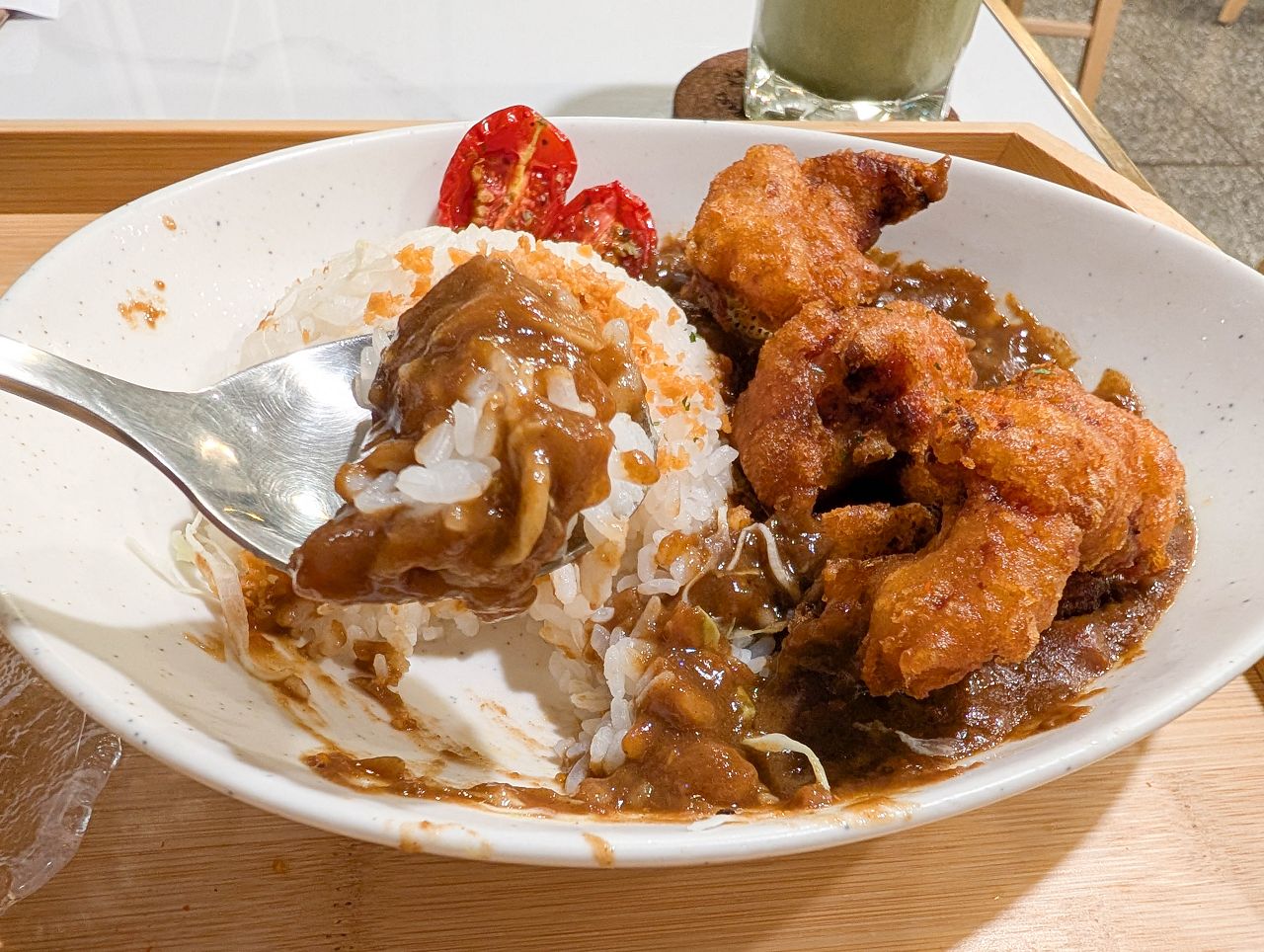 唐揚炸雞搭著咖哩醬汁很下飯。