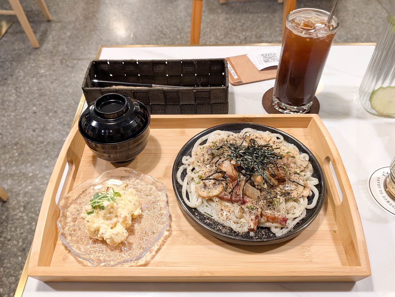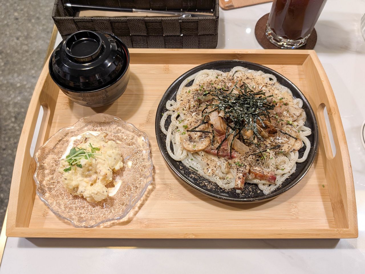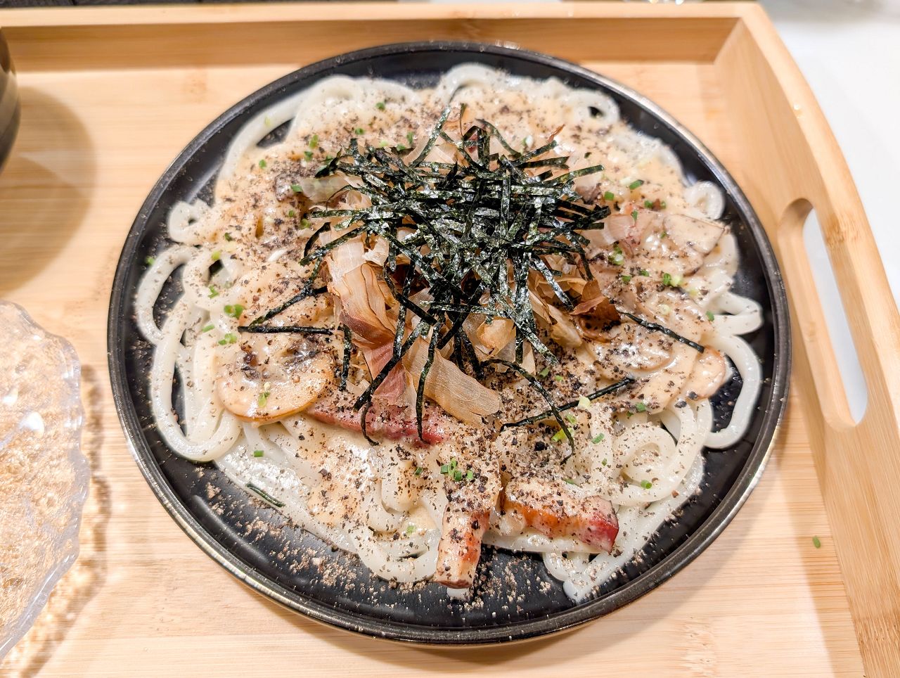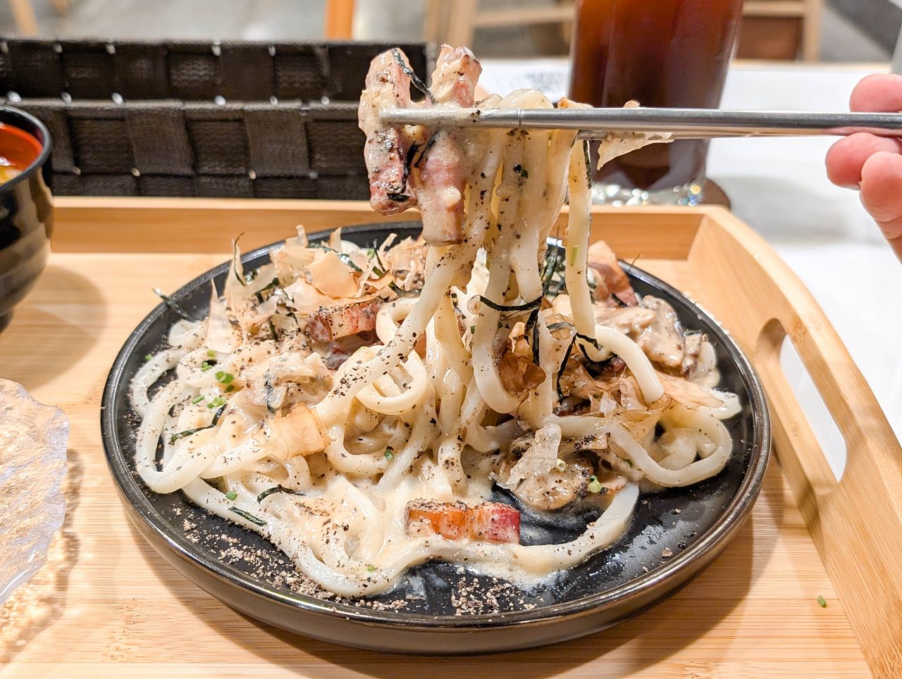 軟Q的烏龍麵搭著濃郁的奶油醬和鹹香培根,