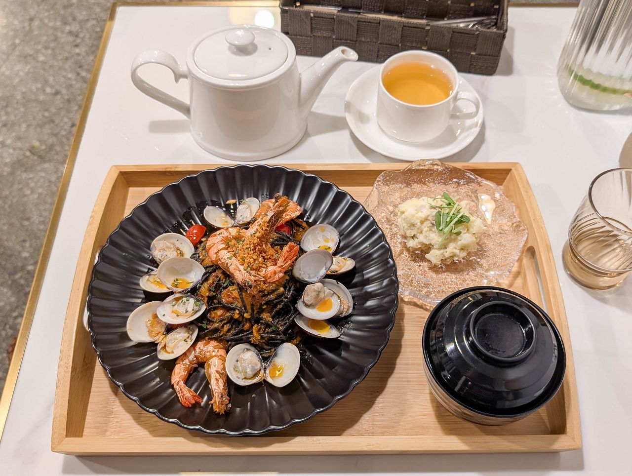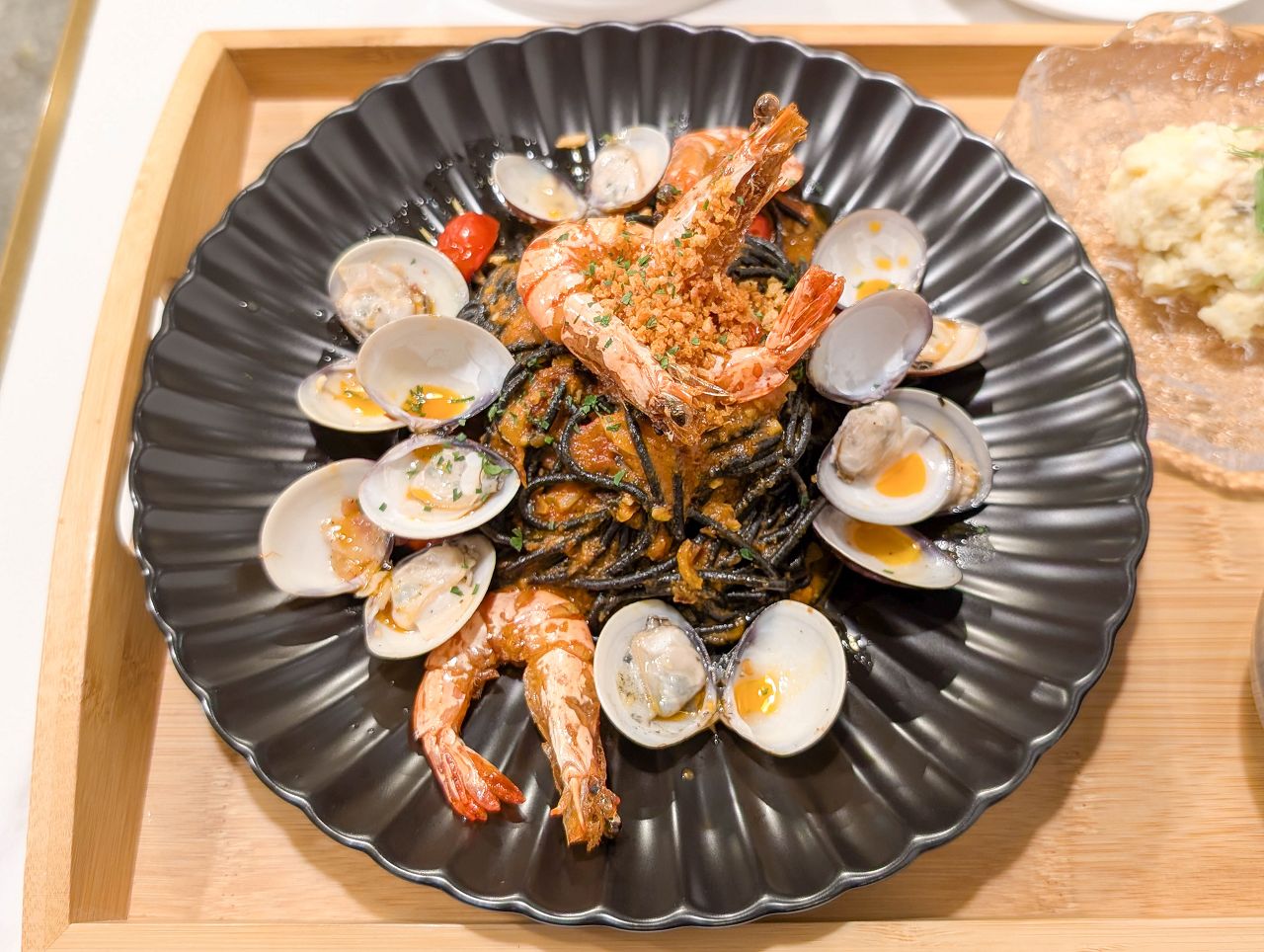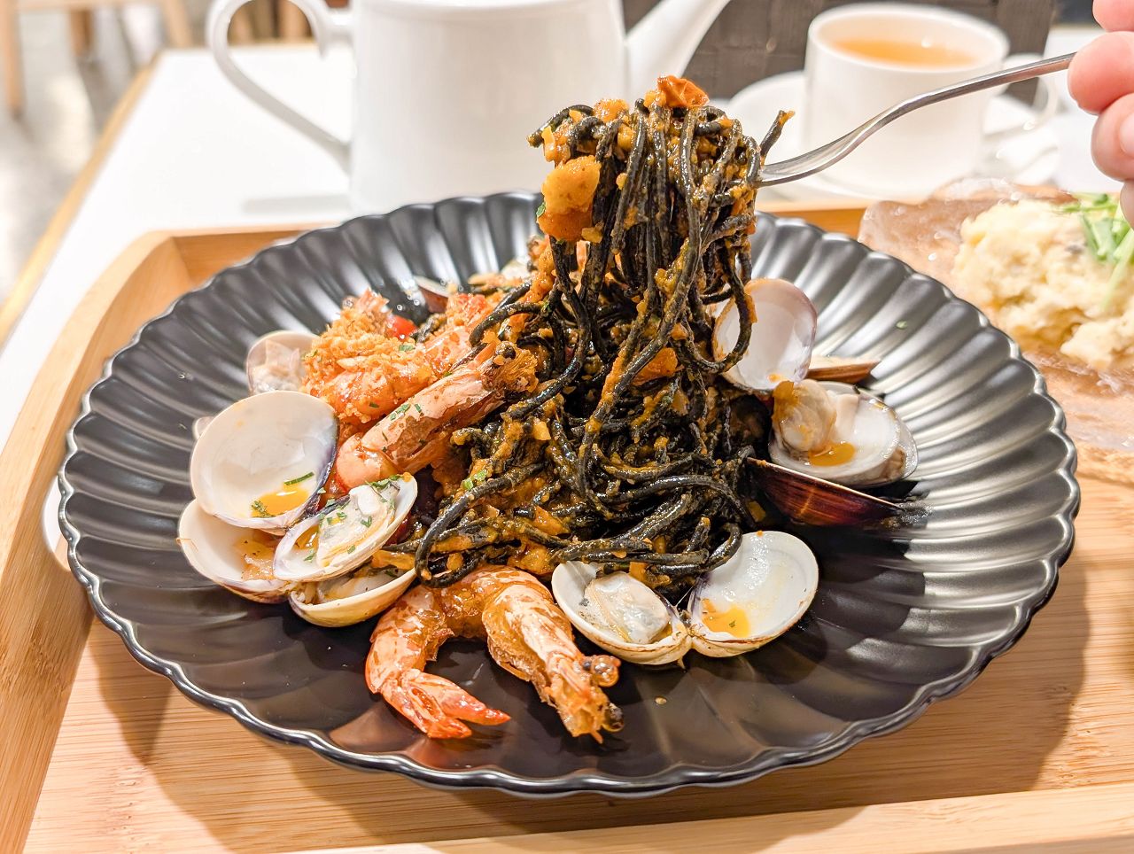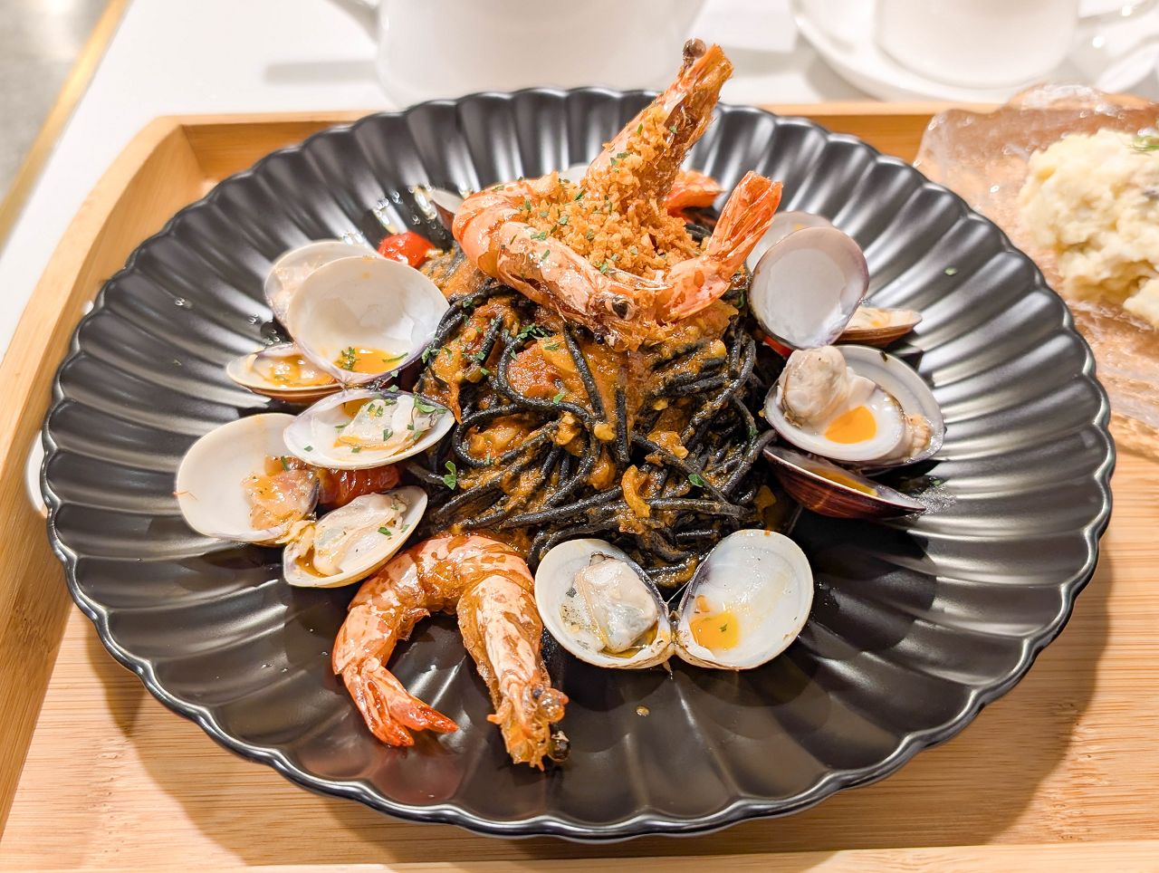 墨魚義大利麵搭配以蒜酥爆炒過的鮮蝦、蛤蠣等,