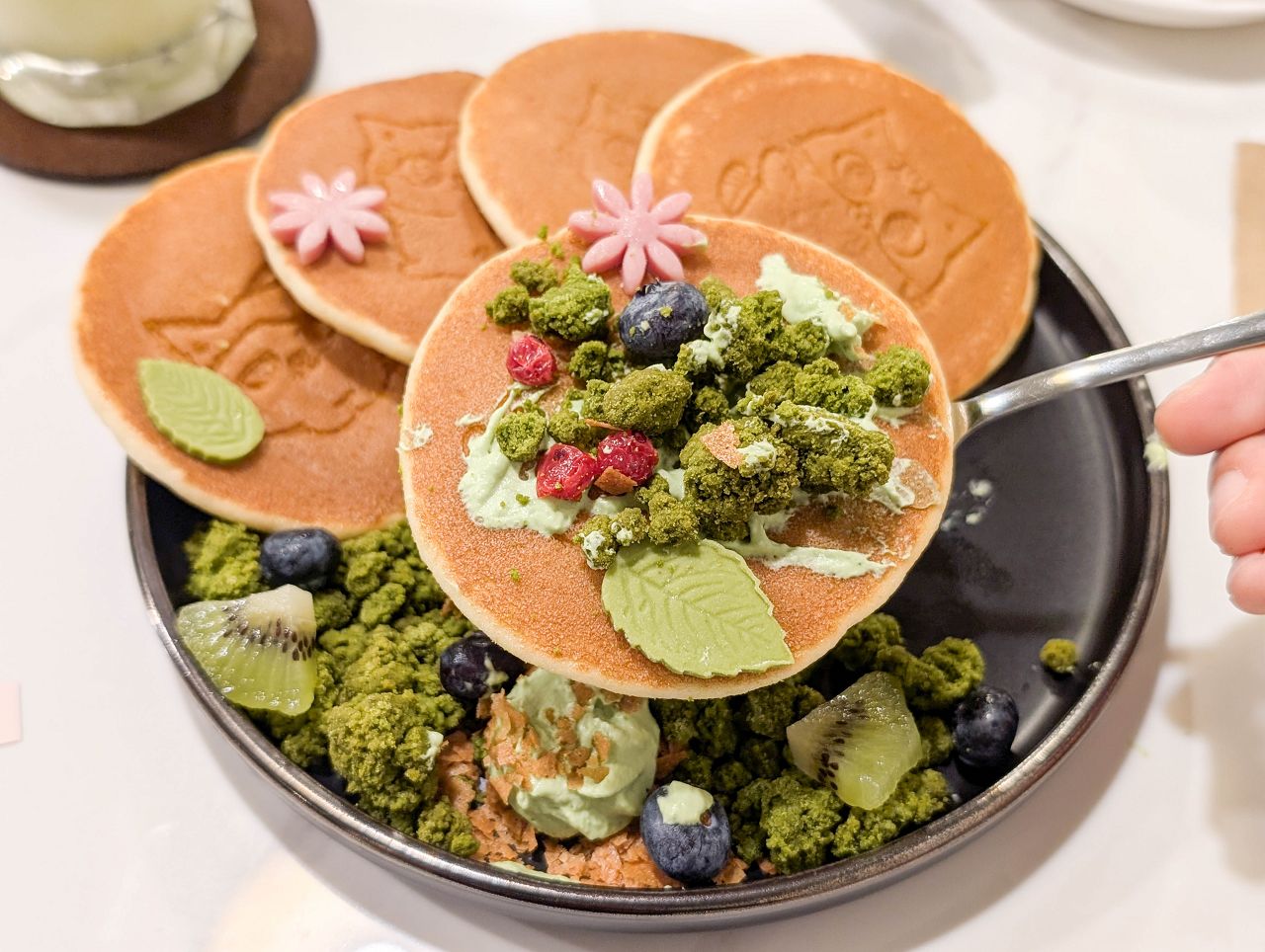 鬆餅搭配抹茶酥香菠蘿粒、抹茶鮮奶油、奇異果、藍莓、葉形和花形巧克力等,